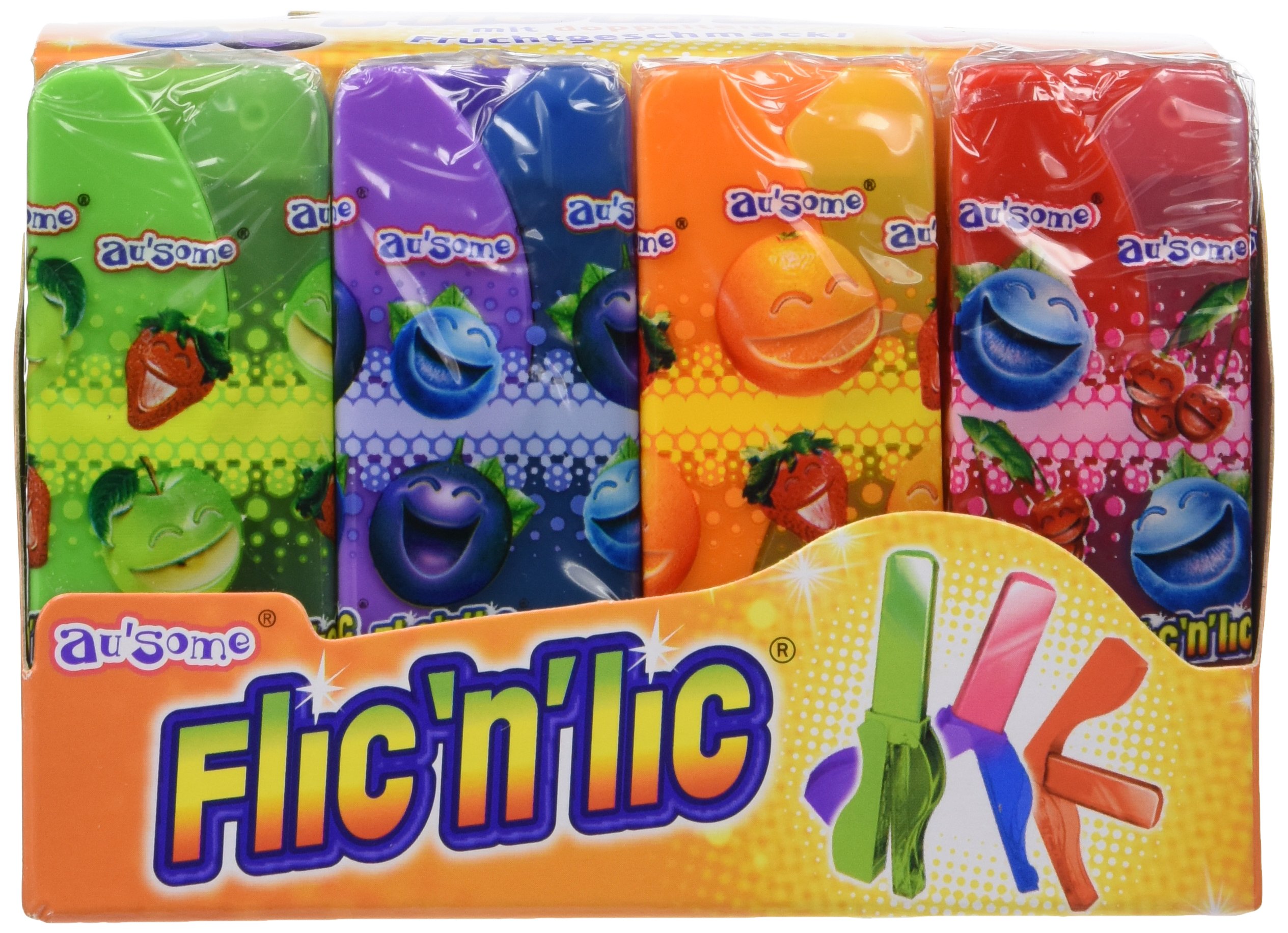 INGREDIENTS Ingredients: Orange and Strawberry Ingredients: sugar, glucose syrup, acid: lactic acid, acidity regulator: sodium citrate, sodium lactate, pear juice concentrate, flavoring, antioxidant: ascorbic acid, colors E163, apple E100 and strawberry Ingredients: sugar, glucose syrup, acids: acid: lactic acid, acidity regulator: sodium citrate, sodium lactate, pear juice concentrate, flavoring, antioxidant: ascorbic acid, colors E141, E100. Blueberry and Blackcurrant Ingredients: sugar, glucose syrup, acid: lactic acid, acidity regulator: sodium citrate, sodium lactate, flavoring, pear juice concentrate, antioxidant: ascorbic acid, colors E163. Blueberry and Cherry Ingredients: sugar, glucose syrup, acid: milk. Acid, gulatory acid: sodium citrate, sodium lactate, pear juice concentrate, flavouring, antioxidant: ascorbic acid, colouring E163Flic N Lic Lot de 24 sucettes (24 x 14 g)DESCRIPTION DU PRODUIT INGRÉDIENTS Ingrédients: Orange et fraise Ingrédients: sucre, sirop de glucose, acidifiant: acide lactique, régulateur d'acidité: citrate de sodium, lactate de sodium, concentré de jus de poire, arôme, antioxydant: acide ascorbique, colorants E163, pomme E100 et fraise Ingrédients: sucre, sirop de glucose, acidients: acidifiant : acide lactique, acide ureregulator: citrate de sodium, lactate de sodium, concentré de jus de poire, arôme, antioxydant: acide ascorbique, colorants E141, E100. Myrtille et cassis Ingrédients: sucre, sirop de glucose, acidifiant: acide lactique, régulateur d'acidité: citrate de sodium, lactate de sodium, arôme concentré de jus de poire, antioxydant: acide ascorbique, colorants E163 myrtille et cerise Ingrédients: sucre, sirop de glucose, acidifiant: lait. Acide, acide gulator: citrate de sodium, lactate de sodium, concentré de jus de poire, arôme, antioxydant: acide ascorbique, colorants E163