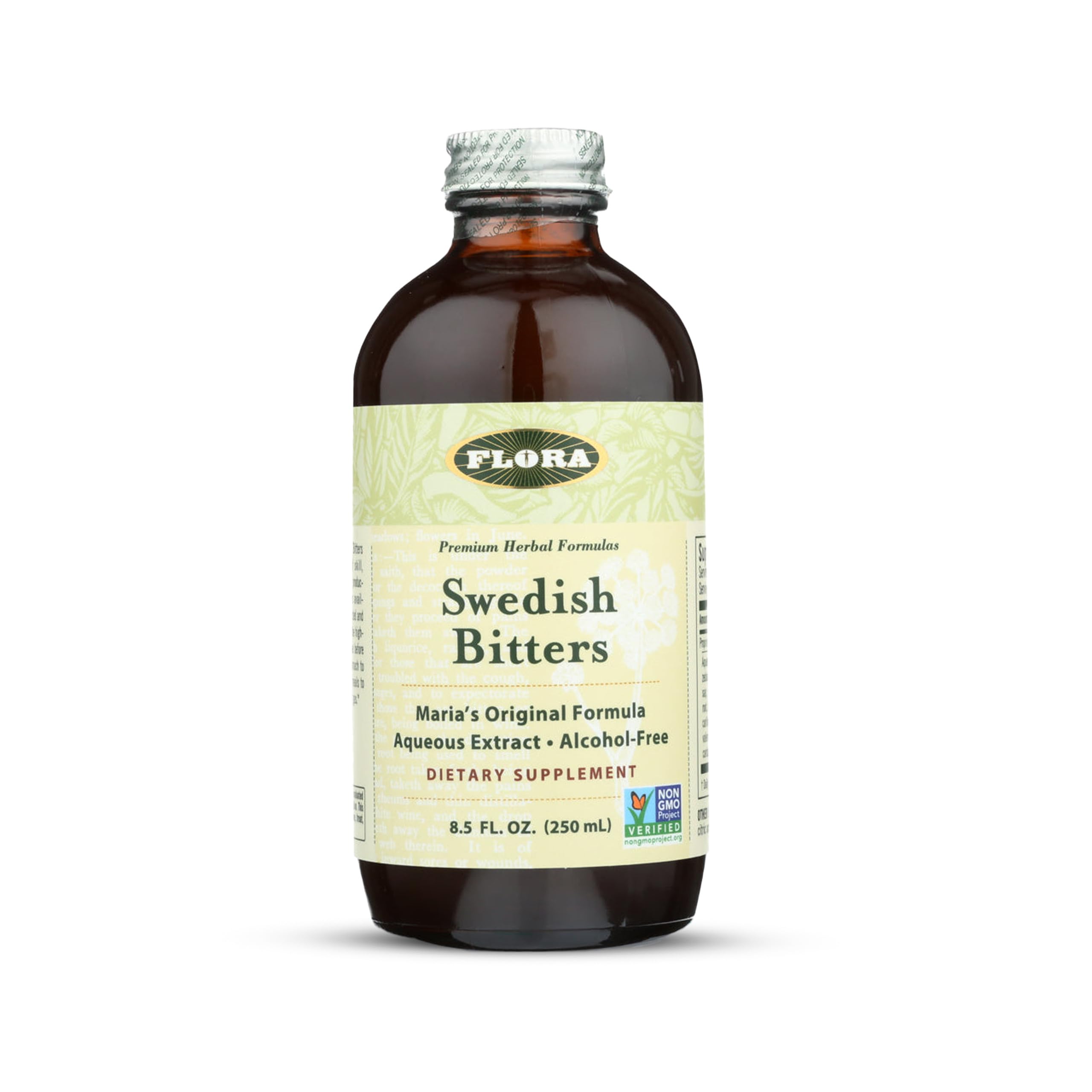 Flora Swedish Bitters - Vegan Digestive Health Supplement - Maria's Original Formula - Includes Angelica Root Valerian Root Myrrh Resin & More - Non-GMO & Kosher - 8.5 fl. oz Glass Bottle 8.5 Fl Oz (Pack of 1)