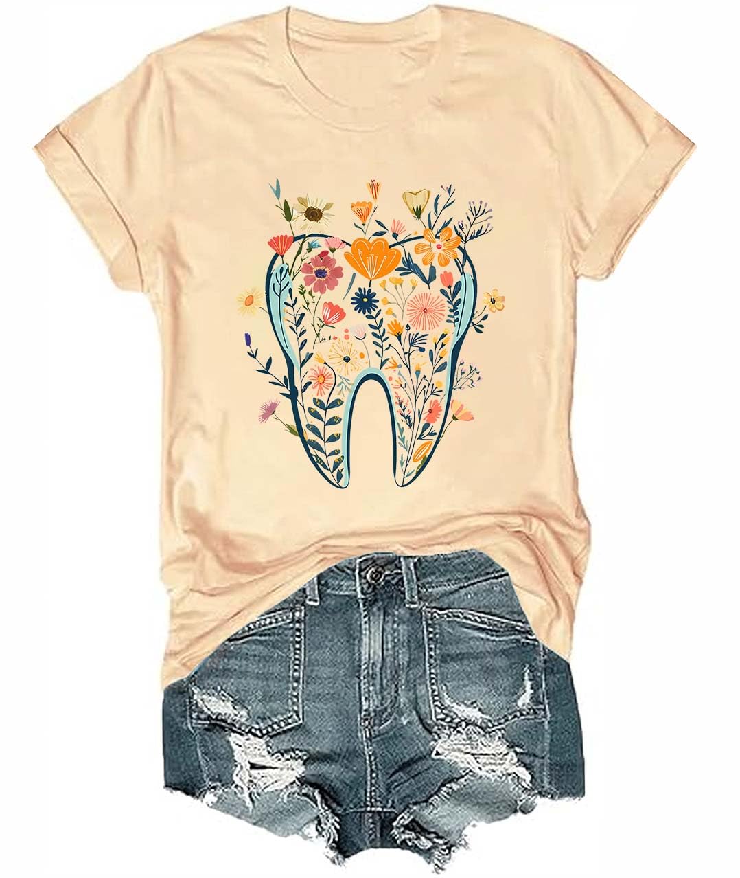 Easy Care:Machine washable. Low-fuss, so focus stays on enjoying your day, not laundry. Versatile Look:Pairs with jeans, skirts, or cardigans. Great for casual gatherings, art events—shows off your unique taste effortlessly. Durable Design:Fade-resistant inks keep the cute message vivid. Soft fabric stays fresh through daily wear. Pretty Fit:Women's XS-3XL, tailored for a flattering feel. Breathable for sunny days, café outings—carries that "creative lively" vibe. Playful Print:"Floral Tooth" on lightweight cotton. Crew V-neck, blends quirky sweetness and casual comfort, perfect for those who love unique, artistic styles.
