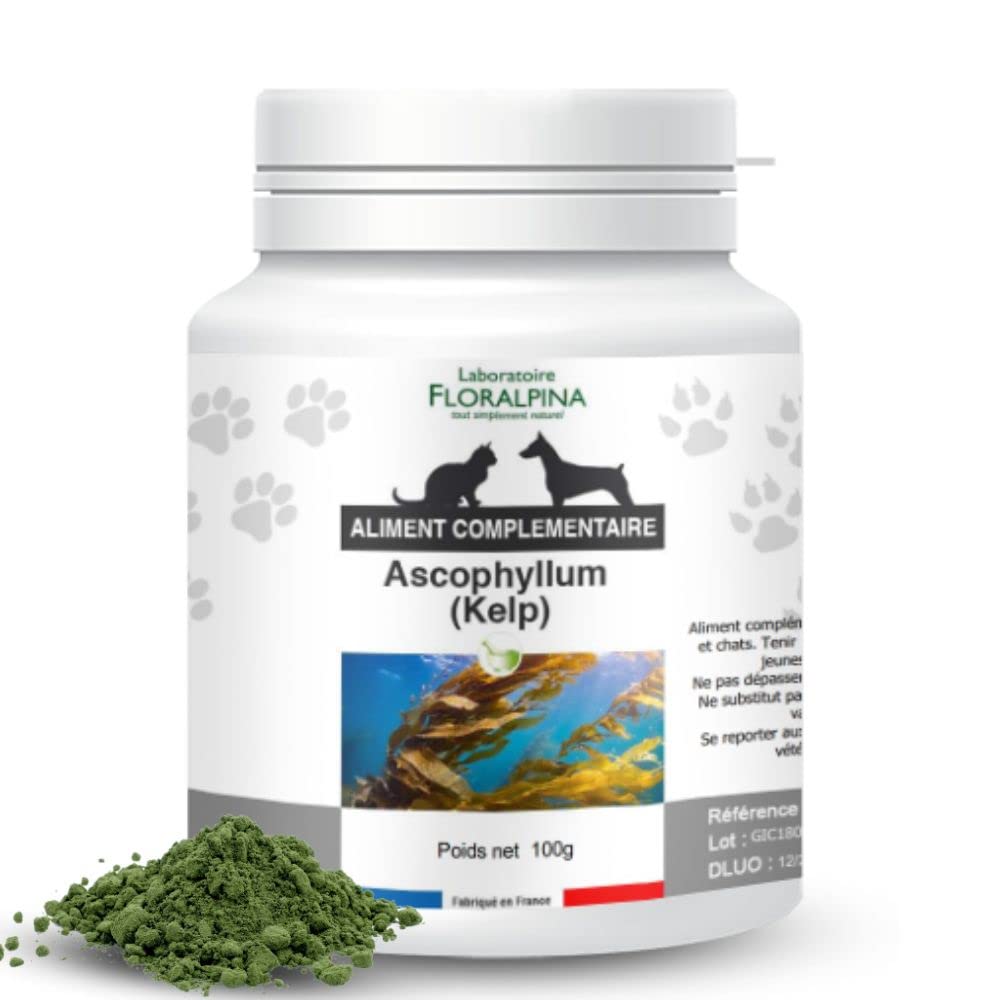 Kelp is a brown seaweed that, once dried and ground into a powder, becomes a powerful complementary food for maintaining healthy thyroid function in cats and dogs. Our product is made from 100 kelp powder and contains no additives or preservatives. It is an ideal natural source of iodine for animals with deficiencies. Its dosage of less than 5,000 ppm meets the needs of dogs and cats while providing numerous health benefits. Thanks to its appealing aroma and convenient size, our kelp powder is very easy to use by mixing it into your pet's food. INGREDIENTS Crude Protein: 14.2 Crude Fiber: 61 Crude Fat: 1.3 Crude Ash: 38 Iodine: 5,000 ppm INSTRUCTIONS FOR USE Kelp powder is easy to use. For cats and puppies, half a scoop per day is sufficient. For dogs under 20 kg, one scoop is recommended, and for dogs over 20 kg, two scoops. It is best to mix the powder with the animal's drinking water or food. See moreAnother advantage of kelp lies in its surface. This surface naturally releases an enzyme that helps soften tartar and prevent plaque buildup. It is therefore an excellent ally for maintaining good oral hygiene. Beyond its richness in nutrients, kelp contributes to a healthy, shiny coat, good digestion, and a strengthened immune system in pets. Furthermore, kelp is rich in minerals and trace elements, including calcium, magnesium, iron, and zinc—essential elements for the overall proper functioning of the body. Powdered kelp is known for its numerous health benefits for pets. This natural source of iodine helps maintain normal thyroid function and a healthy energy metabolism in your dog or cat.Kelp en Poudre 100g pour Chien et Chat - Complément Alimentaire Naturel, Riche en Minéraux et Vitamines, Soutien Santé et VitalitéDESCRIPTION DU PRODUIT DESCRIPTION DU PRODUIT Le kelp est une algue brune qui, une fois séchée et réduite en poudre, devient un aliment complémentaire redoutable pour maintenir une fonction thyroïdienne saine chez le chat et le chien. Notre produit est composé à 100 de poudre de Kelp et ne contient ni additifs, ni conservateurs. Il s'agit d'une source naturelle d'iode idéale pour les animaux carencés. Son dosage inférieur à 5000 ppm respecte les besoins des chiens et des chats tout en apportant ses nombreux bienfaits pour leur santé. Grâce à son odeur appétente et son format, notre poudre de Kelp s'utilise très simplement en mélange dans la nourriture de l'animal. INGRÉDIENTS Protéines brutes : 14.2 Cellulose brute : 61 Matières grasses brutes : 1.3 Cendres brutes : 38 Iode : 5 000 ppm MODE D'EMPLOI Le Kelp en poudre est facile à utiliser. Pour les chats et les chiots, une demi-cuillère dose par jour suffit. Pour les chiens de moins de 20 kg, une cuillère dose est recommandée, et pour les chiens de plus de 20 kg, deux cuillères doseuses. Il est préférable de mélanger la poudre à l'eau de boisson ou à la nourriture de l'animal. Voir plusL'autre avantage du Kelp réside dans sa surface. En effet, celle-ci à la capacité de libérer naturellement une enzyme qui participe à ramollir le tartre et éviter la formation de plaque dentaire. Il est donc un allié de choix pour le maintien d'une bonne hygiène bucco-dentaire. Au-delà de sa richesse en nutriments, le Kelp contribue à instaurer un pelage sain et brillant, une bonne digestion et un système immunitaire renforcé chez les animaux de compagnie. De plus, le Kelp est riche en minéraux et en oligo-éléments dont : le calcium, le magnésium, le fer et le zinc, des éléments essentiels au bon fonctionnement général du corps. Le Kelp en poudre est connu pour ses nombreux bienfaits pour la santé des animaux de compagnie. Cette source naturelle d'iode va permettre d'aider au maintien d'une fonction thyroïdienne normale et d'un métabolisme énergétique sain chez votre chien ou votre chat.