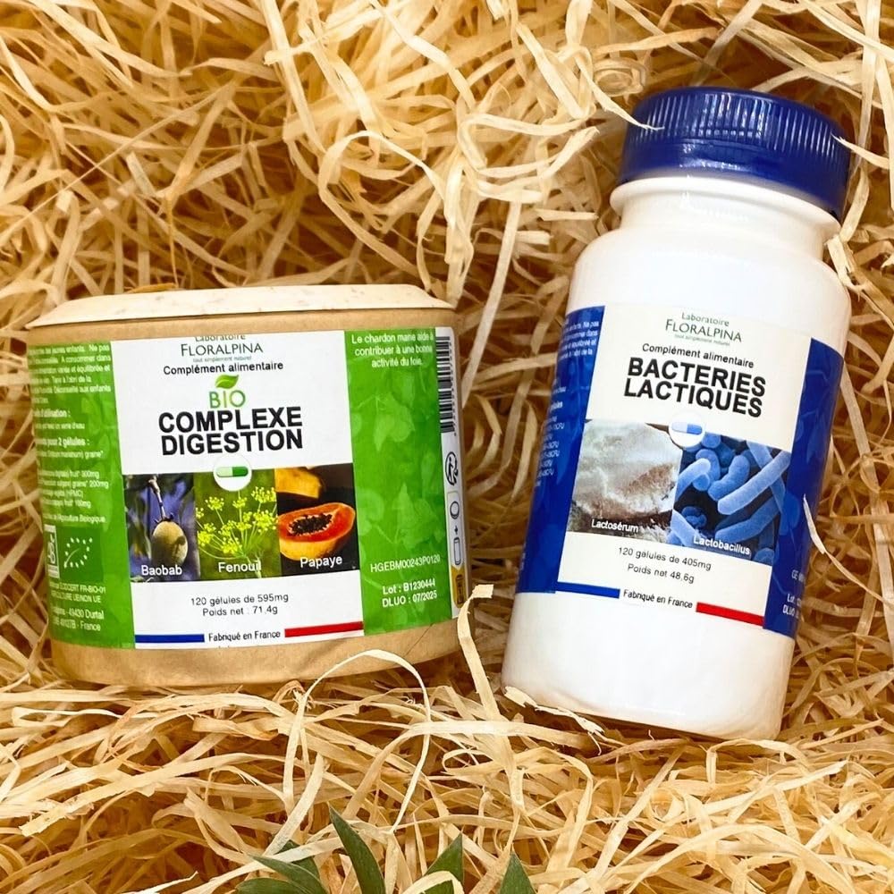 Here is an description of your digestion pack, which includes a 120-capsule organic digestion complex and a 120-capsule lactic acid bacteria supplement: Digestion Pack: Organic Digestion Complex and Lactic Acid Bacteria Supplement - 120 Capsules each. Take care of your digestive system with our digestion pack, specially designed to promote healthy and balanced digestion. This pack combines an organic digestion complex and a lactic acid bacteria supplement to support gut health and improve digestive comfort. Organic Digestion Complex - 120 Capsules: Our organic digestion complex is formulated with a synergistic combination of certified organic herbs and digestive enzymes to help optimize food digestion. High-quality natural ingredients, such as ginger, chamomile, peppermint, and papaya, work together to relieve common digestive issues such as bloating, gas, and abdominal discomfort. This digestive complex also promotes the absorption of essential nutrients, thus contributing to better overall health. Lactic Acid Bacteria Food Supplement - 120 Capsules: Our lactic acid bacteria capsules contain a special selection of probiotics beneficial for restoring and maintaining the balance of the gut flora. Probiotics are live microorganisms that promote optimal digestion, strengthen the immune system, and protect against intestinal infections. Our lactic acid bacteria formula contains premium probiotic strains, such as Lactobacillus acidophilus and Bifidobacterium lactis, to promote healthy digestion and improve gut health.Suitable for vegetarians and contains no artificial additives, GMOs, or common allergens. Promotes a healthy gut flora and strengthens the immune system. Supports food digestion, reduces abdominal discomfort and digestive upset. Natural and certified organic formulas for optimal quality. A duo of essential supplements for optimal digestion and intestinal comfort.Complexe digestion bio 120 gélules et Bactéries lactiques 120 gélules - Pack Digestion : Régulé transit, ballonnement - Confort digestifDESCRIPTION DU PRODUIT Bien sûr, voici une description pour de votre pack digestion comprenant un complexe digestion bio en 120 gélules et un complément alimentaire de bactéries lactiques en 120 gélules : Pack Digestion : Complexe Digestion Bio et Complément Alimentaire de Bactéries Lactiques - 120 Gélules chacun Prenez soin de votre système digestif avec notre pack digestion spécialement conçu pour favoriser une digestion saine et équilibrée. Ce pack combine un complexe digestion bio et un complément alimentaire de bactéries lactiques pour soutenir la santé intestinale et améliorer le confort digestif. Complexe Digestion Bio - 120 Gélules : Notre complexe digestion bio est formulé avec une combinaison synergique d'herbes et d'enzymes digestives certifiées biologiques pour aider à optimiser la digestion des aliments. Les ingrédients naturels de haute qualité, tels que le gingembre, la camomille, la menthe poivrée et la papaye, agissent en harmonie pour soulager les troubles digestifs courants tels que les ballonnements, les gaz et les inconforts abdominaux. Ce complexe digestif favorise également l'absorption des nutriments essentiels, contribuant ainsi à une meilleure santé générale. Complément Alimentaire de Bactéries Lactiques - 120 Gélules : Nos gélules de bactéries lactiques contiennent une sélection spéciale de probiotiques bénéfiques pour restaurer et maintenir l'équilibre de la flore intestinale. Les probiotiques sont des micro-organismes vivants qui favorisent une digestion optimale, renforcent le système immunitaire et protègent contre les infections intestinales. Notre formule de bactéries lactiques contient des souches probiotiques de qualité supérieure, telles que Lactobacillus acidophilus et Bifidobacterium lactis, pour promouvoir une digestion saine et améliorer la santé intestinale.Convient aux végétariens et ne contient aucun additif artificiel, OGM ou allergène commun. Favorise l'équilibre de la flore intestinale et renforce le système immunitaire. Soutient la digestion des aliments, réduit les inconforts abdominaux et les troubles digestifs. Formules naturelles et certifiées biologiques pour une qualité optimale. Un duo de suppléments essentiels pour une digestion optimale et un confort intestinal.