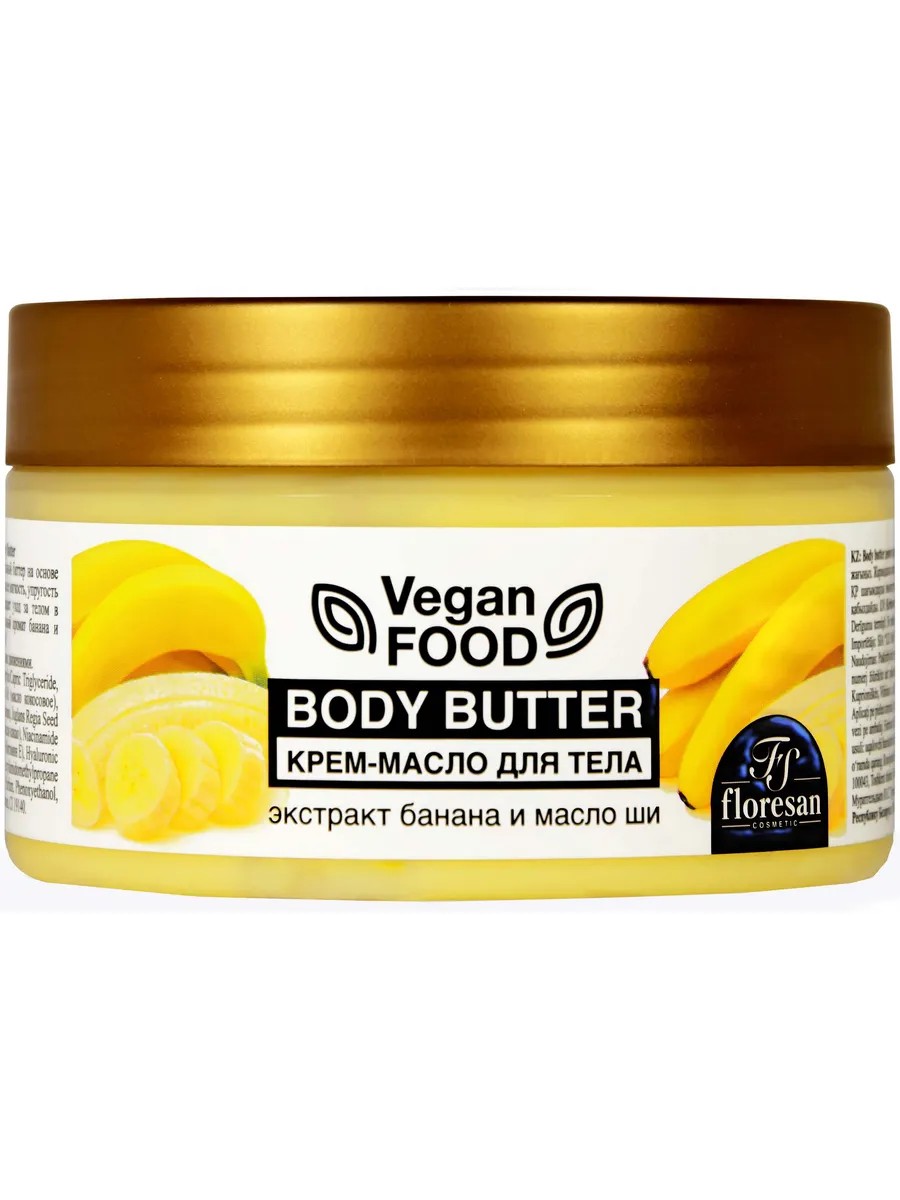 Floresan Vegan Food Body Cream-Butter, Banana Extract and Shea Butter, 250 ml. Pamper your skin with a new treat! This ultra-nourishing shea butter-based butter literally melts into your skin, softening and restoring its softness, firmness, and elasticity. The luxurious, creamy texture transforms body care into a true pleasure. Add to this the delightful banana scent and 24-hour hydration—what could be better? Suitable for vegans. Directions: Apply to body skin with massaging movements. Ingredients: Aqua, Cyclomethicone, Glycerin, Caprylic/Capric Triglyceride, Butyrospermum Parkii Oil (Shea Butter), Cocos Nucifera Oil (Coconut Oil), Cetearyl Alcohol, Musa Sapientum Fruit Extract (Banana Extract), Juglans Regia Seed Oil (Walnut Oil), Theobroma Cacao Seed Butter (Cocoa Butter), Niacinamide, Panthenol, Tocopheryl Acetate (Vitamin E), Hyaluronic Acid, Sodium Acrylate/Sodium Acrylamidomethylpropane Sulfonate Copolymer, Glyceryl Stearate, PEG-100 Stearate, Parfum, Phenoxyethanol, Methylparaben, Ethylparaben, Propylparaben, DMDM Hydantoin, CI 70485 19140. Standard: GOST: 31460-2012