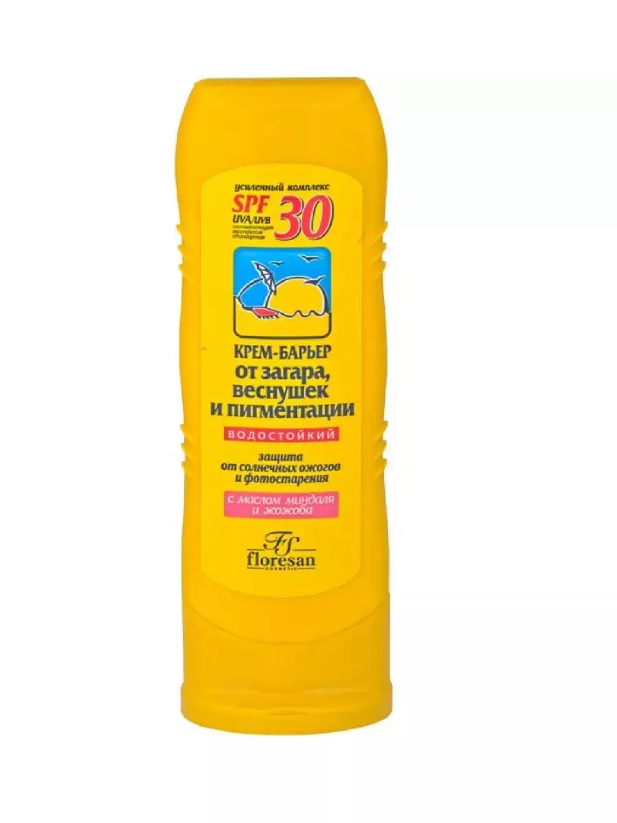 Флоресан, Крем-барьер от загара SPF 30 125 г. Усиленный комплекс UVA/UVB фильтров обеспечивает максимальную защиту кожи от воздействия прямых солнечных лучей и полностью блокируют процесс выработки меланина, являющегося главным фактором появления загара, пигментных пятен и веснушек. Крем обогащен натуральными маслами: кокосовым, миндальным и жожоба, обеспечивающими усиленное питание и увлажнение кожи, подвергающейся инсоляции. Водостойкий. Способ применения: наносить на чистую, сухую кожу лица и тела перед принятием солнечных ванн. Желательно повторить процедуру нанесения крема после двух – трех водных процедур.
