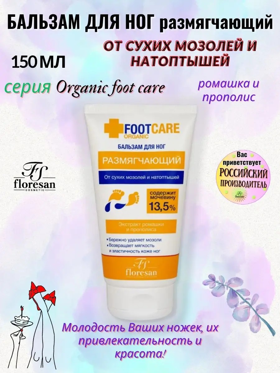 Кожа ног нуждается в постоянном уходе, в чём Вам отлично поможет Бальзам для ног от сухих мозолей и натоптышей размягчающий 150 мл серии Organic foot care Флоресан. Благодаря глубокому кератолитическому действию крем от трещин поможет справиться с сухими мозолями и натоптышами. Увлажняющий и питательный - он способствует интенсивному размягчению и устранению мозолистых образований, предупреждает шелушение. При регулярном применении женская и мужская натуральная косметика является действенным профилактическим средством от появления мозолей и натоптышей. СПОСОБ ПРИМЕНЕНИЯ: Наносите бальзам ежедневно 1-2 раза в день на чистую кожу в область мозолей или натоптышей, втирать до полного впитывания. Применять до полного исчезновения мозолей. Не наносите крем на повреждённую кожу, избегайте попадания в глаза и на слизистые оболочки. Используя косметику товаров из каталога нашего магазина, вы сможете составить отличный бьюти бокс натуральной и органической косметики из России, подарочный набор, новогодний набор в подарок подруге на 8 марта, девушке на новый год, на день влюбленных (14 февраля); маме на день рождения и день матери; папе на 23 февраля, другу на новый год и брату на хэллоуин. Подобрать сюрприз, удивительный подарок на юбилей бабушке. Мы специализируемся на доступной и профессиональной косметике по уходу за кожей, волосами и телом. У нас большой ассортимент товаров для женщин и мужчин. Наша продукция порадует папу и маму, пригодится брату и сестре, станет жестом заботы для жены и девушки; согреет душу дедушке и бабушке; вызовет улыбку на лице у подруги и друга. У нас есть акции и скидки, чтобы ваш шопинг приносил только положительные эмоции. Удачных покупок! Поддержите начинающего продавца, ведь мы старались вложить душу в создание нашего магазина "Фиолетовое небо" и, именно поэтому, у нас еще нет продаж. Мы будем Вам очень признательны, если приобретёте нашу продукцию и поделитесь своим мнением.
