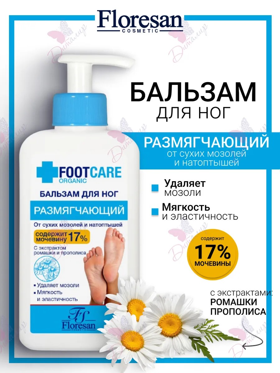 Foot balm with urea and natural extracts of chamomile and propolis is an effective remedy for corns, cracks, dry calluses, and rough skin on the feet.