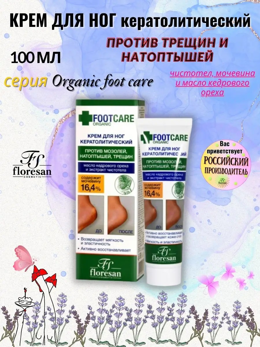 Кератолитический крем для ног против трещин и натоптышей 100 мл серии Organic foot care Флоресан с экстрактом чистотела, мочевиной и маслом кедрового ореха - эффективное средство с мочевиной для борьбы с сухими мозолями и огрубевшими участками кожи стоп. Высокое содержание мочевины (16,4 %) способствует разрыхлению огрубевшей кожи и бережному удалению омертвевших клеток, не затрагивая здоровую кожу. Активный растительный комплекс с натуральными маслами и экстрактами возвращает коже стоп мягкость и эластичность. Для ухода за кожей стоп и пяток. Женская и мужская натуральная косметика подходит для ежедневного применения. Результат - Ваши пяточки, как у младенца! Используя косметику товаров из каталога нашего магазина, вы сможете составить отличный бьюти бокс натуральной и органической косметики из России; подарочный набор; новогодний набор в подарок; подруге на 8 марта; девушке на новый год; на день влюбленных (14 февраля); маме на день рождения и день матери; папе на 23 февраля; другу на новый год и брату на хэллоуин. Подобрать сюрприз; удивительный подарок на юбилей бабушке. Мы специализируемся на доступной и профессиональной косметике по уходу за кожей, волосами и телом. У нас большой ассортимент товаров для женщин и мужчин. Женская и мужская натуральная косметика порадует папу и маму, пригодится брату и сестре, станет жестом заботы для жены и девушки; согреет душу дедушке и бабушке; вызовет улыбку на лице у подруги и друга. У нас есть акции и скидки, чтобы ваш шопинг приносил только положительные эмоции. Удачных покупок! Поддержите начинающего продавца, ведь мы старались вложить душу в создание нашего магазина "Фиолетовое небо" и, именно поэтому, у нас еще нет продаж. Мы будем Вам очень признательны, если приобретёте нашу продукцию и поделитесь своим мнением.