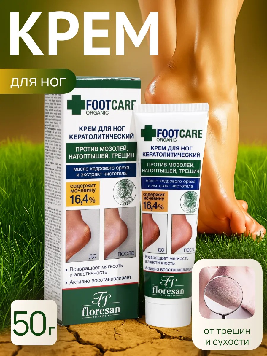 Кератолитический крем для ног Floresan с экстрактом чистотела и маслом кедрового ореха — эффективное средство для восстановления кожи стоп.