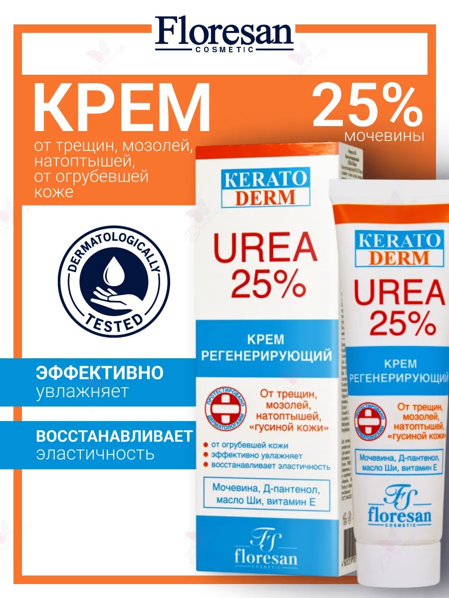 Крем регенерирующий КЕRАТОderm соединяет в своем составе активные вещества- кератолитики, успокаивающие и увлажняющие компоненты для устранения шелушения кожи и эффективной борьбы с мозолистыми образованиями, которые характеризуются значительным утолщением кожи. Высокое содержание мочевины (25%) способствует разрыхлению огрубевшей кожи и бережному удалению омертвевших клеток, не затрагивая здоровую кожу. Активный комплексс натуральными маслами и экстрактами способствует интенсивному увлажнению и возвращает коже мягкость и гладкость. В результате применения даже самые отвердевшие участки становятся эластичными.