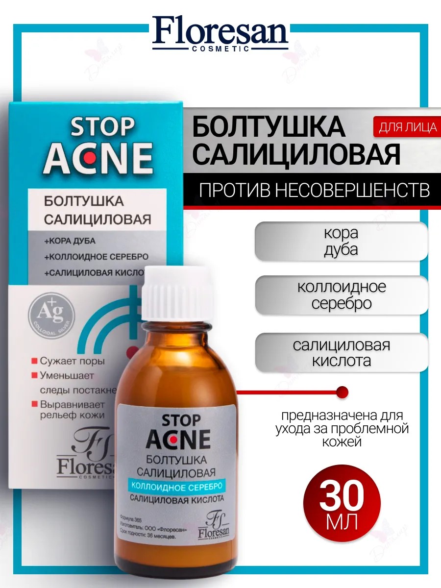 Salicylic Lotion "Boltushka." Salicylic lotion is one of the best products for acne-prone skin and is an excellent preventative measure against breakouts. It effectively cleanses, relieves inflammation, and reduces acne. An antibacterial complex with salicylic acid, colloidal silver, and zinc reduces skin oiliness, dries out pimples, and tightens pores. Medicinal extracts of oak bark, thyme, and sage soothe the skin, preventing new breakouts. With regular use, your skin will glow with health and acquire a well-groomed appearance. Indications: For problem skin with enlarged pores and blackheads. Directions: Shake well, apply a small amount of lotion to a cotton pad, and thoroughly wipe your face, paying special attention to the T-zone (forehead, nose, chin). It is recommended to use morning and evening after washing in combination with an anti-inflammatory cream.