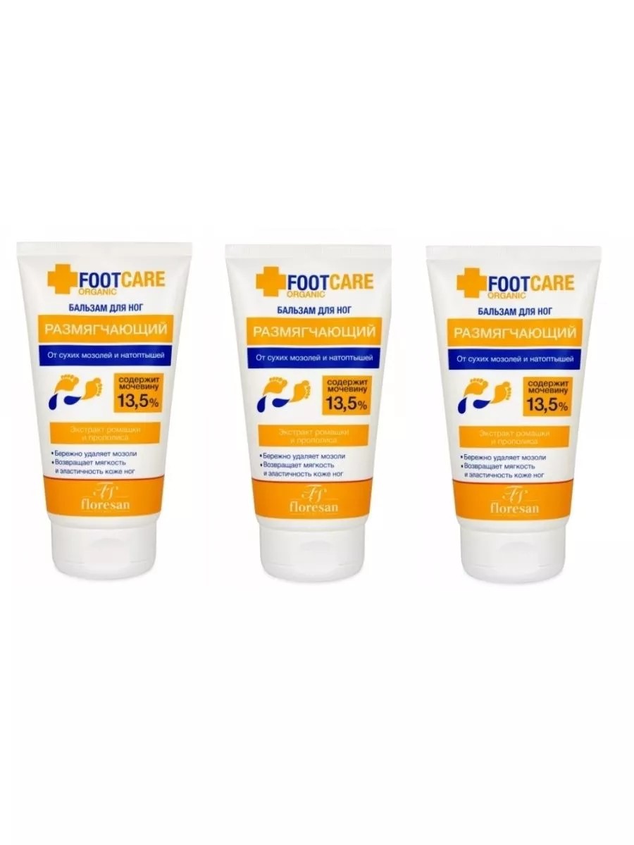 Флоресан Organic FOOT CARE БАЛЬЗАМ для ног от сухих мозолей и натоптышей. 150мл х 3шт.Бальзам для ног с экстрактом ромашки и молочной кислотой - эффективное средство для борьбы с натоптышами, трещинами, сухими мозолями и огрубевшими участками кожи стоп. Содержит 13,5 % мочевины, способствующей разрыхлению огрубевшей кожи и бережному удалению омертвевших клеток, не затрагивая здоровую кожу. Активный растительный комплекс с натуральными маслами и экстрактами возвращает коже стоп мягкость и эластичность. При регулярном применении является действенным профилактическим средством от появления мозолей и натоптышей. Результат - Ваши пяточки, как у младенца!Состав: Вода питьевая, карбамид, спирт цетеариловый, глицерин, пропиленгликоль, масло парфюмерное, диметикон 350, масло кокосовое, стеарат ПЭГ-8, стеариловый спирт и цетеарет - 6, моностеарат глицерина, моноэтаноламид рапсового масла, ПЭГ-40 гидрогенизированное касторовое масло, экстракт прополиса, экстракт ромашки,