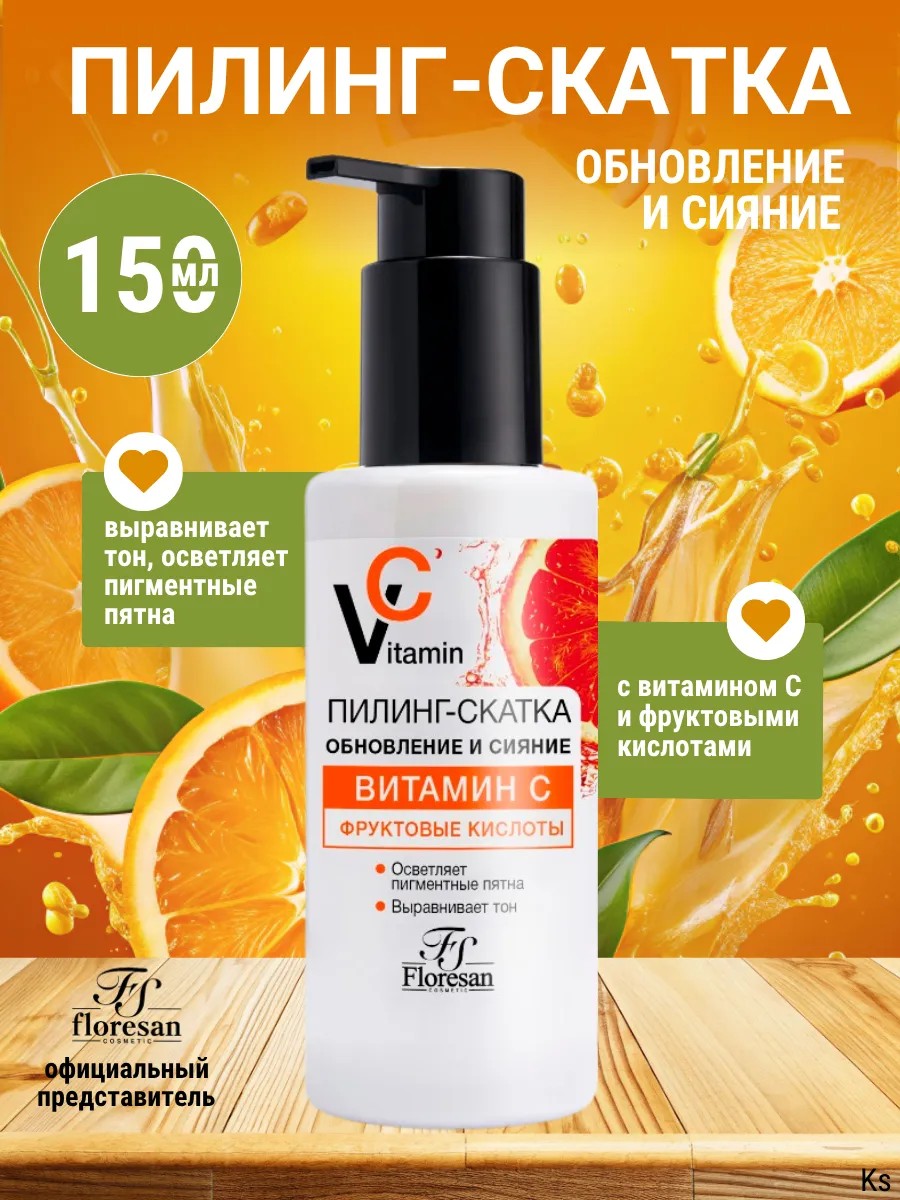 Усиливающая сияние и ровный тон кожи пилинг-скатка с фруктовыми кислотами и витамином С, эффективно устраняет шелушения кожи, очищает кожу от загрязнений, излишков кожного жира и ороговевших клеток эпидермиса, очищая поры и предотвращая появление черных точек. Витамин С восстанавливает защитную функцию кожи, оказывает тонизирующий эффект, предотвращая дряблость кожи, защищает от вредного воздействия свободных радикалов, корректирует признаки старения. Регулярное применение скатки улучшает тонус кожи, оказывает отбеливающее действие и придает лицу сияние, свежий и отдохнувший вид. Осветляет пигментные пятна, выравнивает тон кожи.