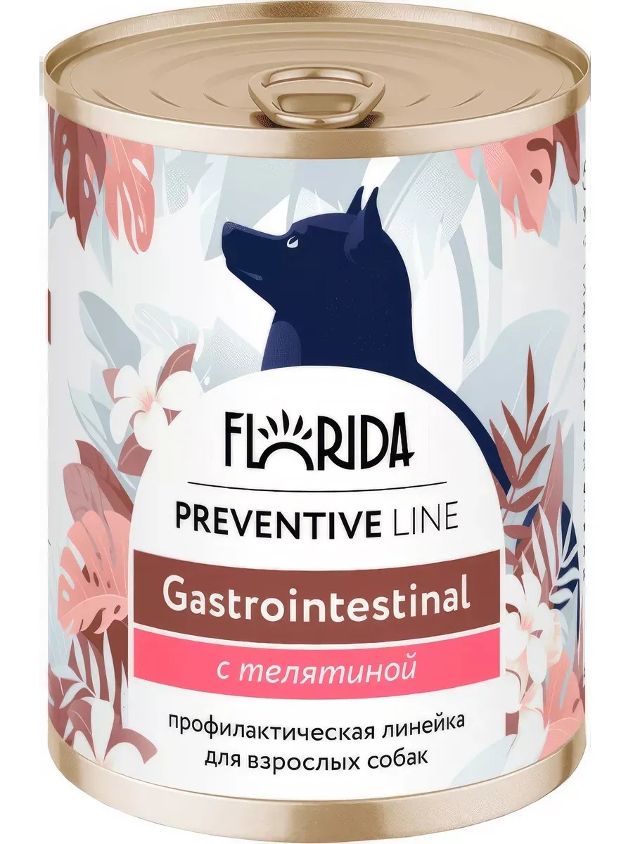Florida Preventive Line Gastrointestinal Canned Food for Dogs, Gastrointestinal Health, with Veal, 340 g x 12 pcs. Florida Preventive Line is a line of preventative foods for pets with different physiological nutritional needs. Florida Preventive Line diets contain nutrients necessary for maintaining health and preventing the development of various diseases in adult cats and dogs. Florida Preventive Line combines natural benefits with modern technology. It is produced using high-quality meat and natural plant ingredients, grown and hand-picked in ecologically clean areas of Russia. Florida Preventive Line Gastrointestinal canned meat is a complete and balanced food for dogs, designed to maintain healthy gastrointestinal tract function. We recommend consulting a veterinarian before using this food. Does not contain artificial colors, flavors, or preservatives. Ingredients: veal, beef by-products (heart, liver, tripe, lung), blood plasma, potato starch, egg powder, fiber, wheat bran, flaxseed oil, fish oil, yeast, seaweed, Jerusalem artichoke, yucca schidigera, jelly. Nutritional value per 100 g: crude protein 8.0% crude fat 4.0% carbohydrates 2.0% vitamin A 2000 IU vitamin D 200 IU vitamin E 3.5 IU calcium 120 mg phosphorus 100 mg Energy value per 100 g: 67 kcal. Feeding recommendations: 60-80 g per 1 kg of dog's weight. The daily rate may vary depending on the age, build and activity level of your pet. Do not forget to refill the bowl with fresh drinking water in a timely manner. Mixed feeding (dry + wet food) is possible. Storage conditions: 0°C to 25°C and relative humidity no more than 75%. Shelf life: 2 years from date of manufacture.