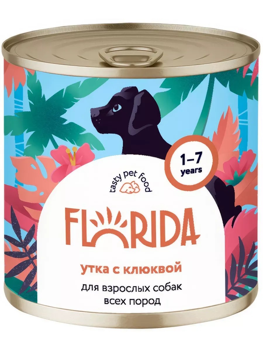 Florida canned food for dogs, with duck and cranberries, 400 g, 6 pcs. Florida canned food for dogs, with duck and cranberries, 400 g x 6 pcs. Florida canned food for dogs - confidence in the quality of your pet's diet! Florida is a natural and balanced canned food. All ingredients are carefully selected to please your pet every day! - no artificial colors - no GMOs, colors or preservatives - highly digestible nutrients - high-quality protein Daily intake 40-60 g per 1 kg of animal weight Ingredients Meat and its derivatives (including duck meat at least 30%), chicken meat (15%), cranberries, sunflower oil 0.6%, vitamin and mineral complex 1%, gelling additive, water. Does not contain soy, flavors, GMOs. Nutritional value per 100 g of product: protein 7.5 g; fat 7.5 g; fiber 0.4 g; ash 2.0 g; mass fraction of salt 0.4-0.6 g; moisture 80%, phosphorus 0.4 g, calcium 0.3 g. Additives per 1 kg of product: vitamin A 3000 IU, vitamin D3 200 IU, vitamin E 22 mg, vitamin C 40 mg, vitamin B1 12 mg, vitamin B2 6 mg, vitamin B6 3 mg, vitamin B12 75 mcg, B6 0.35 mg, biotin 300 mcg, zinc 25 mg, manganese 1.4 mg, iodine 0.75 mg, copper 1 mg. Energy value per 100 g of product is 102.7 kcal.