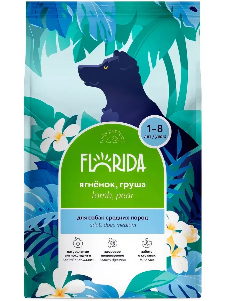 Корм Florida Medium Breed Lamb & Pear для собак средних пород, с ягненком и грушей, 12 кг + 2 кг в подарок. : Florida Lamb Pear - сухой корм супер-премиум-класса с ягненком и грушей для собак средних пород от 1 до 8 лет Сбалансированное полнорационное питание, способствующее гармоничному развитию собаки. В рационе кормов Florida используется только белок животного происхождения. Преимущества корма: натуральные антиоксиданты - ягоды, фрукты, ромашка, розмарин поддержка опорно-двигательной системы - глюкозамин, хондроитин поддержка работы сердечно-сосудистой системы - таурин здоровое пищеварение - отруби, свекла, морковь, дрожжи натуральные источники Омега 3 и 6 кислот, забота о шерсти и коже - семена льна, куриный жир, рыбий жир Нормы кормления: СОСТАВ: Ингредиенты: Дегидрированное мясо говядины, ячмень, маис, животный жир, гидролизованные мясо и печень ягнёнка, отруби, масло лососевых пород, минеральные вещества, пивные дрожжи, сушёная груша, сушёная мякоть свёклы, сушёная морковь, семя льна, витамины, сушеная клюква, куркума, глюкозамин, экстракт розмарина (натуральный антиоксидант), инулин (источник фруктоолигосахаридов), экстракт Юкки Шидигера, хондроитин, таурин Питательная ценность: Протеин 25% жиры 14% клетчатка 3% зола 7% влажность 9% кальций 1,1% фосфор 0,9% медь 12 мг/кг цинк 150 мг/кг железо 100 мг/кг марганец 40 мг/кг йод 4 мг/кг таурин 100 мг/кг витамин А 20000 МЕ/кг витамин Д 1200 МЕ/кг Витамин Е 250 МЕ/кг Энергетическая ценность: 360 ккал / 100 г