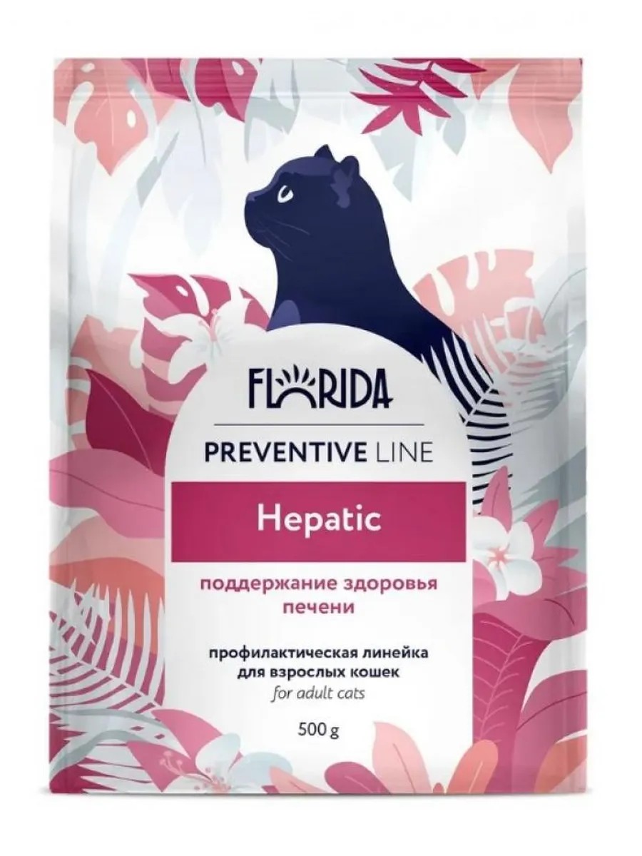 Florida Preventive Line is a line of preventative food for pets with different physiological nutritional needs. Florida Preventive Line diets contain the nutrients necessary to maintain health and prevent the development of various diseases in adult cats and dogs. The Florida Preventive Line combines natural benefits with modern technology. High-quality meat and natural plant ingredients, grown and hand-picked in ecologically clean regions of Russia, are used in production. We recommend consulting a veterinarian before using this food. Feeding recommendations: Transition from the previous diet gradually, in small portions over 5-7 days. Florida Preventive Line Hepatic, a complete, balanced dry cat food, is designed to maintain health and prevent liver dysfunction in adult cats. The optimal content of easily digestible protein in the food reduces the load on the gastrointestinal tract, thereby helping to maintain proper liver function.