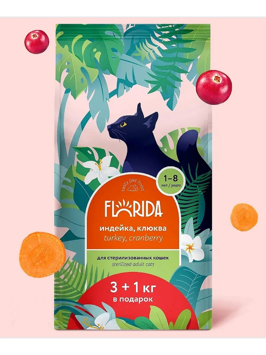 FLORIDA Dry Cat Food with Turkey and Cranberry for Sterilized Cats, Sterilized 34 Turkey, 4 kg FLORIDA dry cat food for sterilized cats is the ideal choice for providing complete nutrition for your furry friends.