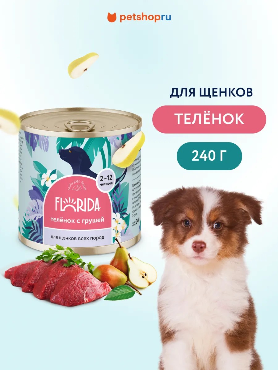 FLORIDA range of wet dog food\n\nCanned food for adult dogs\n\nWith lamb and blueberries:\nFLORIDA Canned food for dogs \Lamb with blueberries\\n\nWith veal and pear:\nFLORIDA Canned food for dogs \Veal with pear\\n\nWith rabbit and lingonberries:\nFLORIDA Canned food for dogs \Rabbit with lingonberries\\n\nWith quail and pear:\nFLORIDA Canned food for dogs \Quail with pear\\n\nWith duck and cranberries:\nFLORIDA Canned food for dogs \Duck with cranberries\\n\nWith salmon and pear:\nFLORIDA Canned food for dogs \Salmon with pear\\n\nWith chicken and apple:\nFLORIDA Canned food for dogs \Chicken with apple\\n\nCanned food for puppies\n\nWith veal and pear:\nFLORIDA Canned food for puppies \Veal with pear\\n\nWith turkey and cranberries:\nFLORIDA Canned food for puppies \Turkey with cranberries\\n\nWith lamb and blueberries:\nFLORIDA Canned food for puppies \Lamb with blueberries\\n\n\nCanned food for dogs Florida - this is confidence in the quality of the diet for your pet! Florida - natural and balanced canned food. \nAll ingredients are carefully selected to please your pet every day! \n\n- Non-GMO, no artificial colors or preservatives \n- Highly digestible nutrients \n- High-quality protein \n- Human Grade raw material quality standard \n- Benefits of berries - a source of natural antioxidants, vitamins and minerals.\n\nFeeding recommendations: Daily intake 40-60 g per 1 kg of animal weight. \nProvide your pet with fresh drinking water.