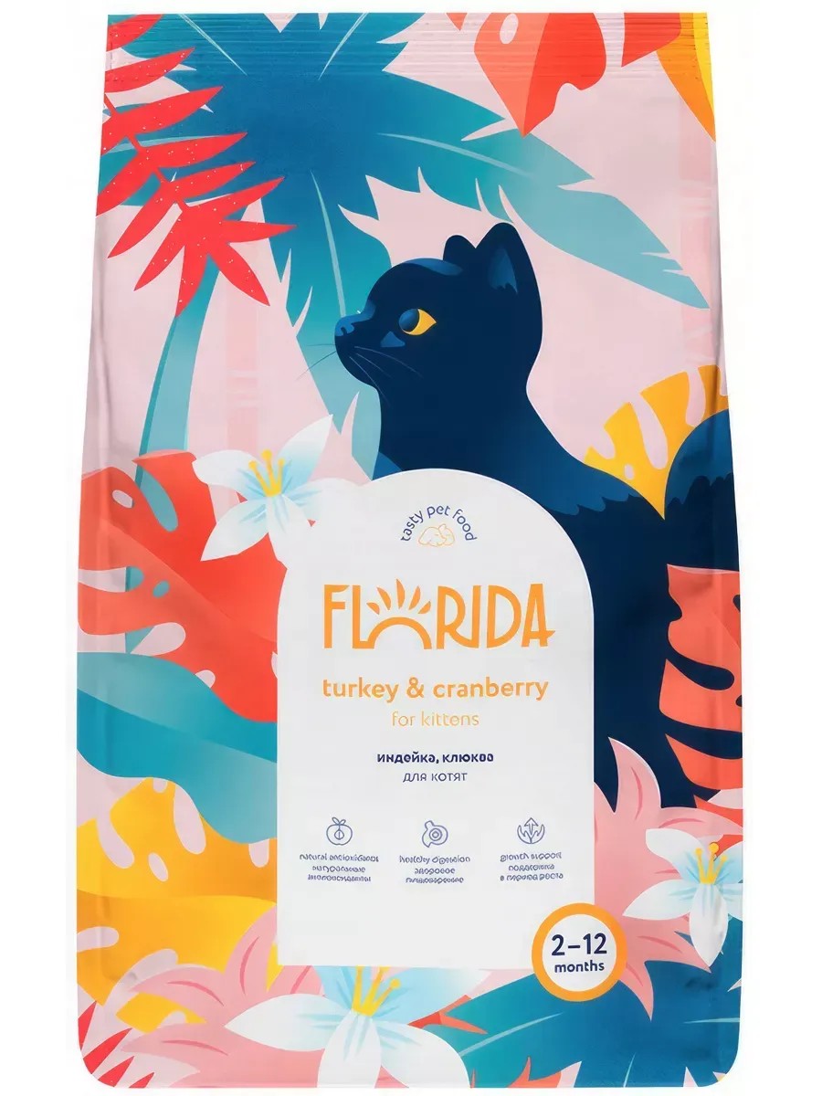 Florida Kitten Turkey & Cranberry Kitten Food, with Turkey and Cranberry, 800 g. : Florida Turkey Cranberry is a super-premium dry food with turkey and cranberry for kittens from 2 to 12 months. Balanced complete nutrition promotes healthy digestion and supports the body with various vitamins during growth. Advantages of the food: natural antioxidants - berries, fruits support of the musculoskeletal system - glucosamine, chondroitin support of the cardiovascular system, vision - taurine healthy digestion - beets, carrots, yeast natural sources of Omega 3 and 6 acids, care for coat and skin - flax seeds, chicken fat, fish oil. The daily rate may vary depending on the age, build and activity level of your pet. Do not forget to promptly replenish the bowl with fresh drinking water.