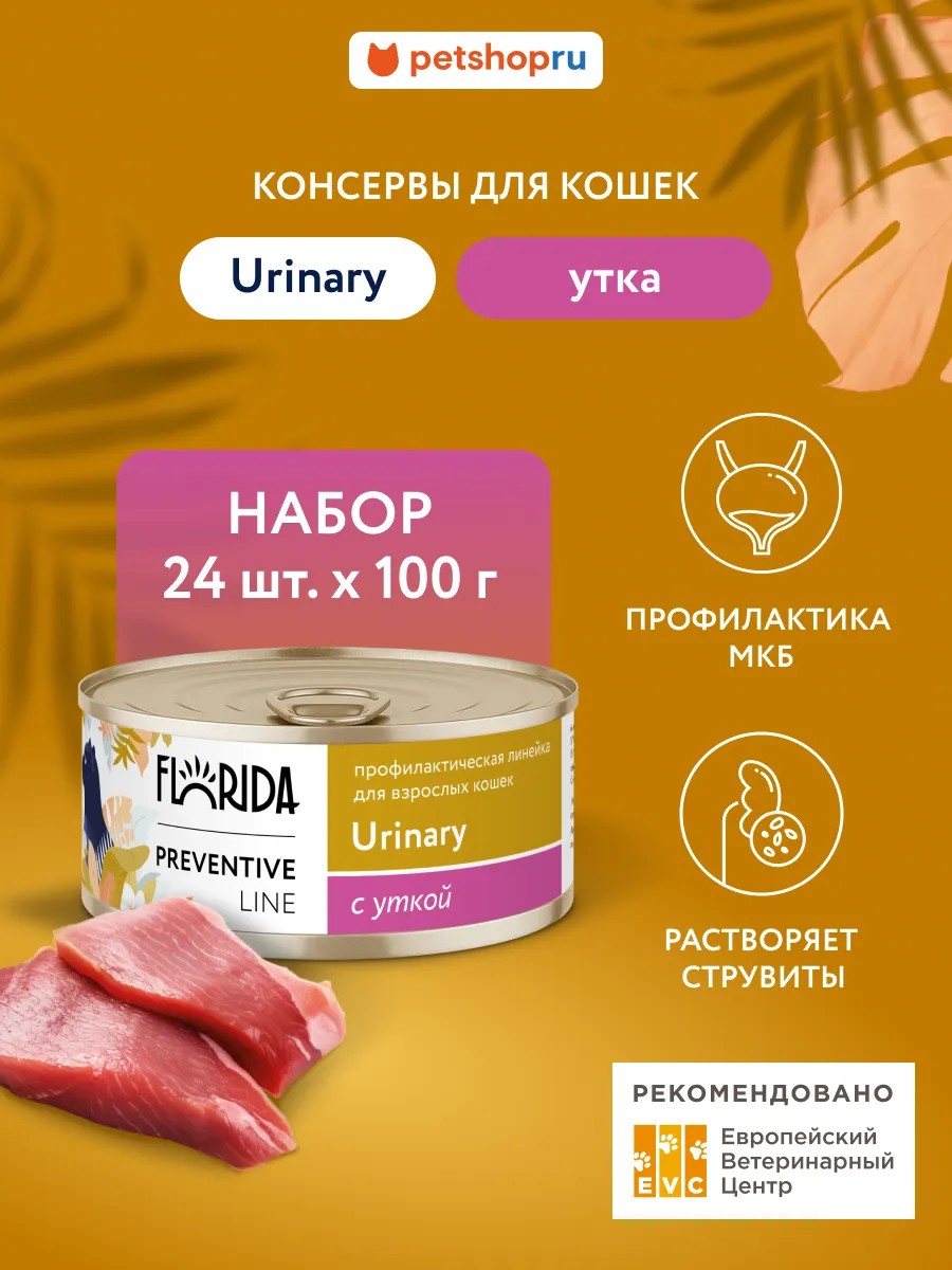 Мясные консервы Florida Preventive Line Urinary - полнорационный диетический профилактический корм для кошек, который предназначен для поддержания здоровья мочевыделительной системы и профилактики образования струвитных уролитов.