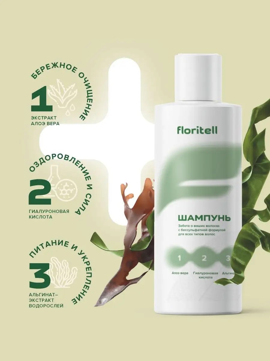 Floritell sulfate-free shampoo is formulated with natural ingredients: hyaluronic acid, aloe vera extract, and alginate. Hyaluronic acid and aloe vera restore weakened hair and are used for hair loss and growth. This deep-cleansing shampoo, thanks to its unique formula, creates a rich lather during washing, gently cleansing the hair and scalp without overdrying. It also normalizes sebum production, making it effective for oily hair. This natural, sulfate-free, silicone- and paraben-free formula is ideal for daily use on all hair types—from normal to oily roots, dry ends, and color-treated or hair prone to loss. It does not contain harsh surfactants or harmful dyes. This silicone- and paraben-free shampoo does not irritate the scalp or affect the lipid balance. This natural hair care product rinses off easily and doesn't dry out your hair. This moisturizing shampoo also contains alginate, which nourishes the hair, restoring its moisture balance without weighing it down. Regular use strengthens hair, adds volume at the roots, and stimulates new hair growth. This hair care product has a pleasant, fresh scent of green lingonberry leaf, which will leave you feeling fresh for a long time. This shampoo with hyaluronic acid moisturizes and restores hair along its entire length, making it easy to comb, adding volume, and smoothness. Suitable for both men and women. This hair care product is not tested on animals and does not contain animal ingredients. It is made in Russia. Directions: 1. Shake the bottle. 2. Apply a small amount of shampoo to damp hair. 3. Add more water to create a thicker lather. 4. Gently massage into the scalp. 5. Rinse thoroughly with water, repeating if necessary. Floritell professional hair care is ideal for daily use and will preserve the beauty and shine of your hair.