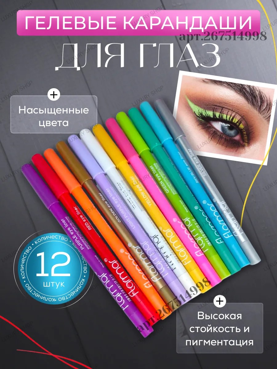 Наш новый набор цветных карандашей для глаз 12 штук - незаменимый аксессуар в вашем арсенале для создания великолепного макияжа. Наборы включают цветные карандаши различных цветов: от классических черных и белых до ярких фиолетовых и розовых. Этот косметический набор обеспечит вам максимальную гибкость в создании разнообразных макияжей для глаз. Также гелевые карандаши можно использовать для создания стрелок, контура или просто для добавления цвета в макияж. Благодаря своей мягкой текстуре, они легко скользят по коже, что обеспечивает точные линии и растушевку для мягкого, нежного или выразительного взгляда. Наша водостойкая до 12 часов формула гарантирует долгое ношение макияжа без размазывания. Эти лайнеры для глаз также подходят для использования на губах и даже на лице, что позволяет вам раскрыть свою творческую натуру и экспериментировать с различными макияжами. Цветные карандаши для глаз созданы на основе восковой формулы с добавлением ланолина, что делает их кремовыми и матовыми. Они придают интенсивный цвет с тонкой текстурой, которая позволяет легко создавать различные эффекты - от деликатного и естественного до яркого и выразительного. С помощью этих карандашей также можно создавать макияжи в китайском или корейском стиле так, как это делают модницы из Кореи. При нанесении под углом 90 градусов обеспечивает тонкую, точную линию, для более толстой линии нанесите под более острым углом.