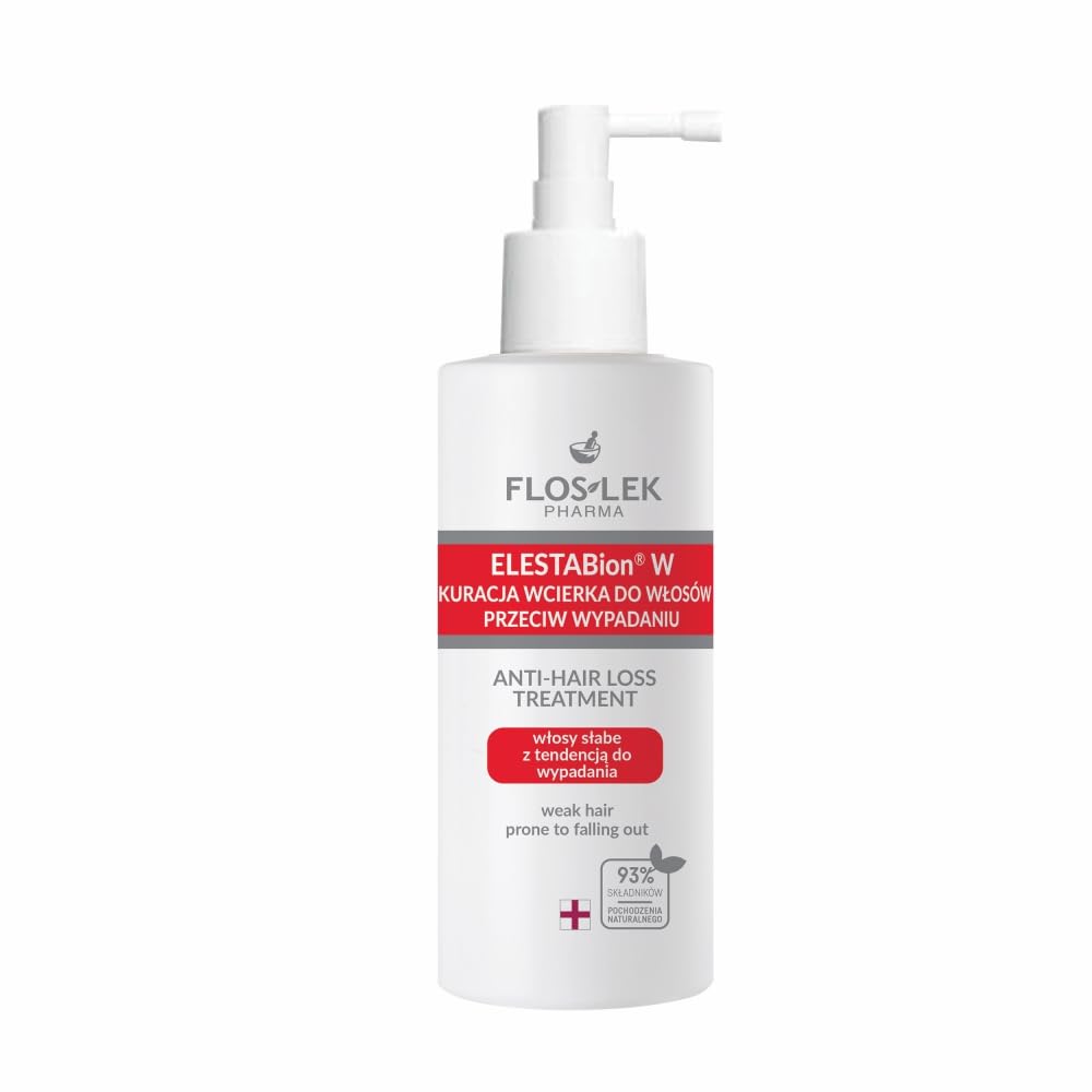Take the best possible care of your hair and it will return the favor with a great look. If you have recently noticed that your hair is weak, thinning and tends to fall out, reach for ELESTABion W hair treatment by FlosLek. It is a concentrated treatment, perfect for both women and men. The product reduces hair loss and accelerates regrowth of new hair, thus increg hair density. ELESTABion W FlosLek hair treatment regenerates and cares for hair, restoring its splendid appearance. It makes them regain their shine and silky softness. They become more resilient, making them easier to comb and style. . The FlosLek ELESTABion W hair treatment is based on natural ingredients. You will find Trichogen VEG - a multi-component complex with extracts of burdock, ginseng, wheat germ, soy proteins, arginine, tyrosine and vitamin H, which counteracts hair loss. In turn, bioactive peptides and oligosaccharides from soya germ help to restore hair to a great condition and beautiful appearance. B vitamins stimulate the process of keratin formation, regenerating hair strands, and panthenol soothes irritations, has a soothing effect and moisturises the scalp. FlosLek's hair care products have been formulated to help prevent hair loss. FlosLek's ELESTABion W hair rub does not weigh hair down or make it sticky. Thus, it provides them with a beautiful, fresh look. It is also easy to apply. Simply rub the product into the scalp. The active ingredients are then massaged gently into the hair roots and deep into the skin. ELESTABion W FlosLek hair treatment is suitable for use on both wet and dry hair. It does not require rinsing. In order to achieve the best and fast results, it is recommended to use FlosLek ELESTABion W hair treatment together with other preparations from the same series. INGREDIENTS Aqua, Alcohol Denat., Propylene Glycol, Panax Ginseng Root Extract, Panthenol, Butylene Glycol, Arginine, Acetyl Tyrosine, Arctium Majus Root Extract, Hydrolyzed Soy Protein, Polyquaternium-11, PEG-12 Dimethicone, Calcium Pantothenate, Zinc Gluconate, Niacinamide, Ornithine HCL, Citrulline, Glucosamine HCL, Biotin, , Glycine Soja Germ Extract, Triticum Vulgare Germ Extract, PPG-26-Buteth-26, PEG-40 Hydrogenated Castor Oil, Polyquaternium-10, Citric Acid, Sodium Hydroxide, Chlorphenesin, Disodium Succinate, Methylparaben, Ethylparaben, Phenoxyethanol, Potassium Sorbate, Parfum, BHT DIRECTIONS Simply rub the product into the scalp. Massage gently into the hair roots and skin. Suitable for use on both wet and dry hair. Does not require rinsing. See moreEASY TO USE - FlosLek ELESTABion W hair treatment simply rubs into the scalp. A gentle massage is recommended to allow the active ingredients to better penetrate into the hair follicles. The product does not need to be rinsed out. WITHOUT WEIGHTING EFFECT - ELESTABion W FlosLek Hair Cleanser does not weigh down the hair, thus guaranteeing a perfect appearance of the hairstyle. The product does not make hair strands sticky. Can be applied on wet or slightly dry hair. TRADITIONAL COMPOSITION - FlosLek ELESTABion W hair treatment contains natural ingredients viz: burdock extract, wheat germ, ginseng and soy proteins. The formula is enriched with B vitamins and panthenol. The product is dermatologically and trichoscopically tested. IMPROVES LOOK - ELESTABion W FlosLek hair treatment regenerates hair, making it shinier and silky soft. Increases hair elasticity, making it easier to comb and style. Has a beneficial effect on hair condition. HAIR STRENGTHENING - ELESTABion W hair rub by FlosLek reduces hair loss and prevents hair thinning. Increases their density and improves the quality of regrowing hair strands. Ideal for weak and thin hair.