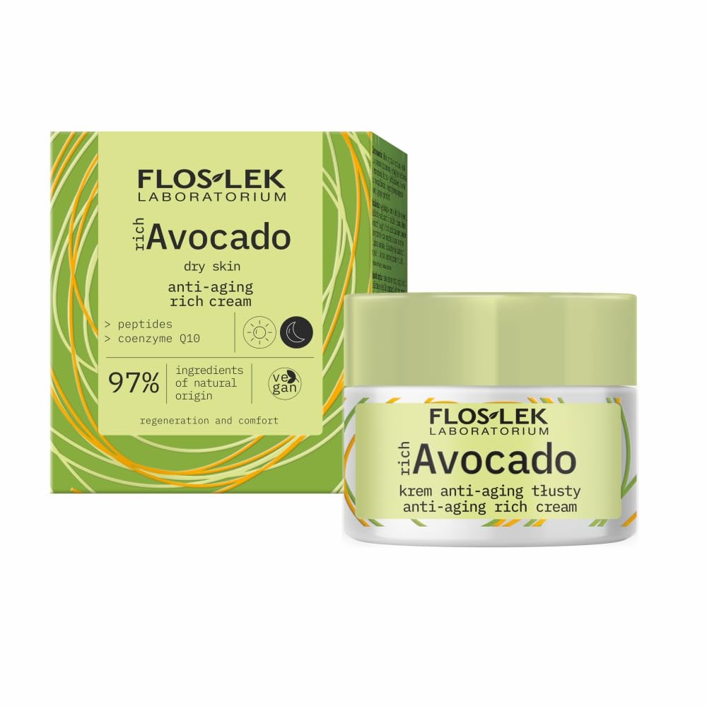 FlosLek richVOCADO Oil Cream has a nourishing effect. It nourishes and moisturizes the skin and supports the skin's natural regeneration processes. It helps rebuild the skin's hydrolipidic film, thus preventing dryness. It evens out skin tone and soothes irritations. In this way, the skin not only regains its youthful appearance but also becomes radiant and silky. FlosLek RichVOCADO Day and Night Cream also provides an effective barrier against the negative effects of external factors, including pollution and smog. This cosmetic is distinguished by its excellent composition. It contains no less than 97 naturally derived ingredients. It contains avocado oil, which has a powerful moisturizing and regenerating effect and reduces the appearance of skin imperfections, as well as coenzyme Q10—an antioxidant that helps eliminate the effects of oxidative stress, which leads to premature cell aging. FlosLek Anti-Wrinkle Cream is enriched with peptides that stimulate collagen synthesis and have a brightening effect, and shea butter, which makes skin soft and supple and protects it from external aggressors. Vitamin E helps fight free radicals, Fucocert intensely moisturizes and soothes dry skin, and panthenol reduces the feeling of roughness and relieves irritation. FlosLek Rich Avocado Anti-Aging Cream has a rich texture. Apply regularly to thoroughly cleansed skin and massage the product in with circular motions or pat it in with your fingertips. The product is suitable for both day and night use, even under makeup. It has a completely vegan formula. . INGREDIENTS Aqua , Persea Gratissima oil , caprylic capriceride triglyceride , glycerin , isoamyllaurate , hydrogenated tri(polyglyceryl-3 laury) , butyrospermum Parkii butter , prunus amygdalus dulcis oil , sodium chloride , hydrogenated olive oil. , , Helianthus Annuus Seed Cera , Olea Europaea Fruit Oil , Ubiquinone, Gum-1 Biosaccharide, Panthenol, Tocopherol Acetate, Olea Europaea Oil Unsaponifiable Oil , Hydrolyzed Rice Protein , Helianthus Annuus Seed Oil , Daucus Carota Sativa Root Extract , Daucus Carota Sativa aucus Carota S Oil ativa seed , beta-carotene , fragrance, ascorbyl palmitate, tocopherol, olive oil , pentylene glycol, C12-15 alkyl benzoate, decylene glycol, sodium phytate , citric acid, sodium levulinate , glyceryl caprylate, sodium anisate , sodium benzoate. at, the sorde potassium bat, o-cymen-5-ol, triethoxycaprylylsilane, CI 77289 . Ingredients of natural originFor day and night – FlosLek richAVOCADO anti-wrinkle cream has a rich texture. You can easily spread it on the skin with circular motions or by patting with your fingertips. The product is suitable for both day and night use. Natural composition – FlosLek richAVOCADO day and night cream contains up to 97 naturally derived ingredients, including avocado oil, peptides, shea butter, coenzyme Q10, and vitamin E. The cosmetics are enriched with fucocert and panthenol. Vegan product. For mature skin – FlosLek richAVOCADO oil-based cream is designed for mature skin. It is suitable for both normal and dry skin. It leaves the skin silky, soft, and radiant. Nourishes – FlosLek richAVOCADO anti-aging cream contains ingredients that nourish and moisturize the skin. Supports the natural processes of cell regeneration. Provides comfort and soothing relief. Promotes the reconstruction of the skin's hydrolipidic film. Anti-aging action – FlosLek's RichAVOCADO Oil Cream effectively smooths existing wrinkles and prevents the formation of new ones. Restores skin density and elasticity. Makes skin more supple and firm.FLOSLEK richAvocado Crème lissante de jour et de nuit SPF 15 Soin de jour et de nuit pour peaux sèches, matures et sensibles Protection UV pour vitalité et élasticité de la peau 50 mlDESCRIPTION DU PRODUIT DESCRIPTION DU PRODUIT La crème huileuse FlosLek richVOCADO a un effet nourrissant. Elle nourrit et hydrate la peau et soutient les processus naturels de régénération du teint. Elle aide à reconstruire le manteau hydrolipidique de l'épiderme et prévient ainsi le dessèchement. Équilibre le teint de la peau et soulage les irritations. De cette façon, la peau retrouve non seulement son aspect jeune, mais elle devient aussi éclatante et soyeuse. La crème de jour et de nuit RichAVOCADO FlosLek offre également une barrière efficace contre les effets négatifs des facteurs externes, y compris la pollution et le smog. . Les cosmétiques se distinguent par leur excellente composition. Elle contient pas moins de 97 de composants d'origine naturelle. Il contient de l'huile d'avocat qui a un fort effet hydratant et régénérant et atténue l'apparence des imperfections de la peau, ainsi que de la coenzyme Q10 - un antioxydant qui aide à éliminer les effets du stress oxydatif qui conduit à un vieillissement prématuré des cellules. La crème anti-rides FlosLek est enrichie en peptides qui stimulent la synthèse du collagène et ont un effet éclaircissant, ainsi que du beurre de karité qui rend la peau douce et souple et la protège des agressions extérieures. La vitamine E aide à combattre les radicaux libres, Fucocert hydrate intensément et apaise la peau sèche, et le panthénol réduit la sensation de rugosité et soulage les irritations. La crème anti-âge FlosLek richAVOCADO a une texture riche. Appliquez régulièrement sur une peau soigneusement nettoyée et massez les cosmétiques avec des mouvements circulaires ou tapotez-les du bout des doigts. Le produit convient aussi bien pour la nuit que pour le jour, même sous le maquillage. Il a une formule entièrement végétalienne. . INGRÉDIENTS Aqua , huile de Persea Gratissima , triglycéride capryle capricéride , glycérine , isoamyllaurate , tri(polyglyceryl-3 laury) hydrogénée , butyrospermum Parkii beurre , huile de prunus amygdalus dulcis , chlorure de sodium , huile d'olive hydrogénée. , , Helianthus Annuus Seed Cera , huile de fruit Olea Europaea , ubiquinone, biosaccharide 