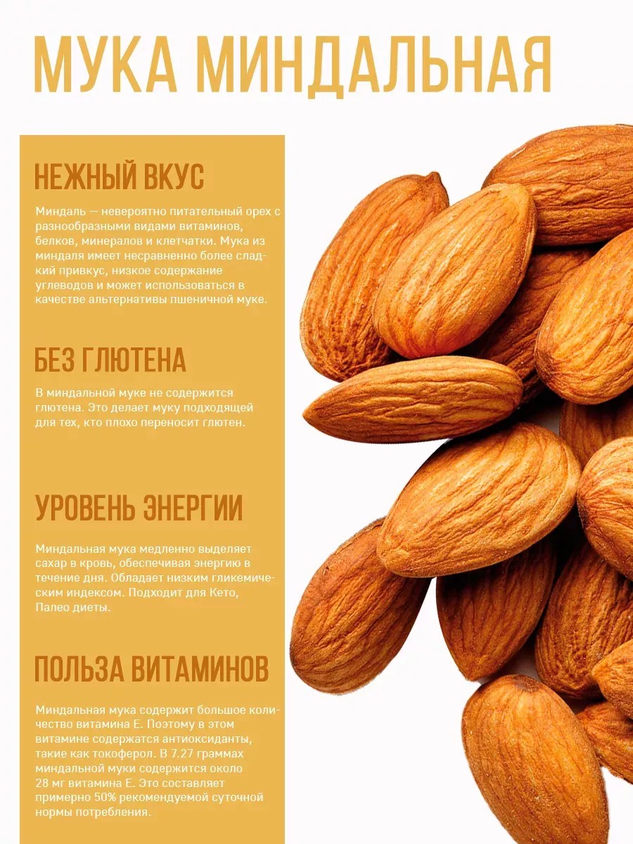 Миндальная мука белого цвета - лучший выбор для кето - диеты и веганского образа жизни. Универсальный продукт здорового питания с низким содержанием углеводов подходит для приготовления печенья, пирожных, соусов, смузи и многих других вкусных рецептов. Мельчайший помол из турецких миндальных орехов делают ее идеальным источником клетчатки, витаминов, минералов и микроэлементов полезных для здоровья. Миндаль хорош и в качестве перекуса, и как ингредиент различных блюд. Из него делают молоко, марципан и муку, а миндальное масло используют в косметологии. Его неоспоримые преимущества — не только приятный, тонкий вкус, но и полезный состав! Попробуйте самый вкусный продукт для веганов - миндальную муку для правильного питания и похудения. Ее можно использовать для приготовления коктейлей, вместо панировочных сухарей, для изготовления сливочных десертов и даже для выпечки кексов, пиццы и макарон. Это полезный и съедобный элемент вашего пищевого меню, который порадует вас своим неповторимым вкусом и принес пользу для здоровья. Низкоуглеводная диетическая мука в упаковке на 1 кг и 2 кг - отличный подарок для любителей здоровой еды и органических продуктов. Подарите себе здоровую пищу с привкусом традиционных сладостей из Турции и длительным сроком хранения. Подходит для приготовления теста для блинов, оладьев и маффинов, а также для производства кондитерских изделий типа макарунов и сдобных булок. Экстраароматная и слегка маслянистая мука мелкого помола, подходящая для постных блюд и системы питания на кето - диете. Эта продукция - суперфуд для вашей кухни, которая подарит вам наслаждение сладким вкусом и сильным ароматом без вреда для организма. Это популярный продукт для приготовления диетических сладостей, видеорецепты которых вы можете найти в сети. Это орехпродукт с высоким содержанием жирных кислот омега 3, имеющий насыщенный вкус и невероятный аромат. Продукт растительного происхождения без глютена для маленьких радостей в жизни, используя который вы можете приготовить натуральные вкусняшки для здорового питания. Этот суперфуд имеет отличные вкусовые свойства, которые приятно удивят ваших близких. Банка миндальной муки станет прекрасным подарком для любой домохозяйки, любящей готовить. Вы можете купить ее для своей мамы, жены или любимой девушки. У нас есть акции и распродажи, вы можете купить наши товары в подарок или со скидкой!