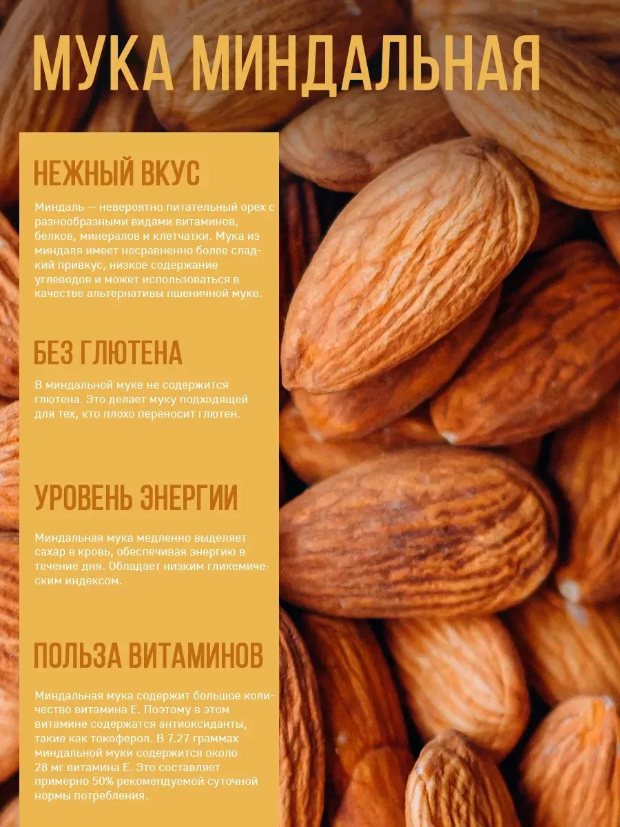 Миндальная мука белого цвета - лучший выбор для кето - диеты и веганского образа жизни. Универсальный продукт здорового питания с низким содержанием углеводов подходит для приготовления печенья, пирожных, соусов, смузи и многих других вкусных рецептов. Мельчайший помол из турецких миндальных орехов делают ее идеальным источником клетчатки, витаминов, минералов и микроэлементов полезных для здоровья. Миндаль хорош и в качестве перекуса, и как ингредиент различных блюд. Из него делают молоко, марципан и муку, а миндальное масло используют в косметологии. Его неоспоримые преимущества — не только приятный, тонкий вкус, но и полезный состав! Попробуйте самый вкусный продукт для веганов - миндальную муку для правильного питания и похудения. Ее можно использовать для приготовления коктейлей, вместо панировочных сухарей, для изготовления сливочных десертов и даже для выпечки кексов, пиццы и макарон. Это полезный и съедобный элемент вашего пищевого меню, который порадует вас своим неповторимым вкусом и принес пользу для здоровья. Низкоуглеводная диетическая мука в упаковке на 1 кг и 2 кг - отличный подарок для любителей здоровой еды и органических продуктов. Подарите себе здоровую пищу с привкусом традиционных сладостей из Турции и длительным сроком хранения. Подходит для приготовления теста для блинов, оладьев и маффинов, а также для производства кондитерских изделий типа макарунов и сдобных булок. Экстраароматная и слегка маслянистая мука мелкого помола, подходящая для постных блюд и системы питания на кето - диете. Эта продукция - суперфуд для вашей кухни, которая подарит вам наслаждение сладким вкусом и сильным ароматом без вреда для организма. Это популярный продукт для приготовления диетических сладостей, видеорецепты которых вы можете найти в сети. Это орехпродукт с высоким содержанием жирных кислот омега 3, имеющий насыщенный вкус и невероятный аромат. Продукт растительного происхождения без глютена для маленьких радостей в жизни, используя который вы можете приготовить натуральные вкусняшки для здорового питания. Этот суперфуд имеет отличные вкусовые свойства, которые приятно удивят ваших близких. Банка миндальной муки станет прекрасным подарком для любой домохозяйки, любящей готовить. Вы можете купить ее для своей мамы, жены или любимой девушки. У нас есть акции и распродажи, вы можете купить наши товары в подарок или со скидкой!