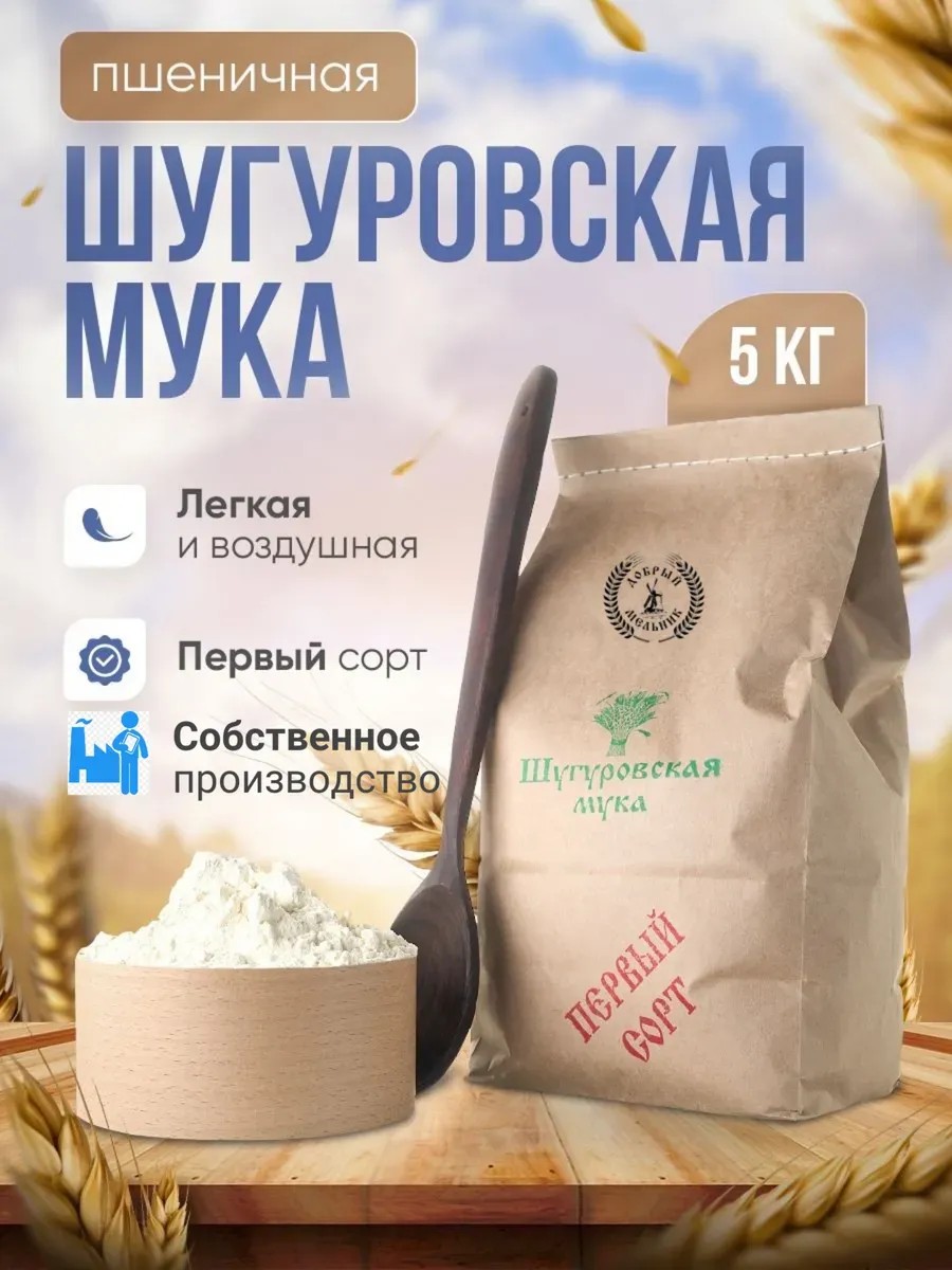 | Комплектация | Мука Шугуровская пшеничная первого сорта 5 кг |