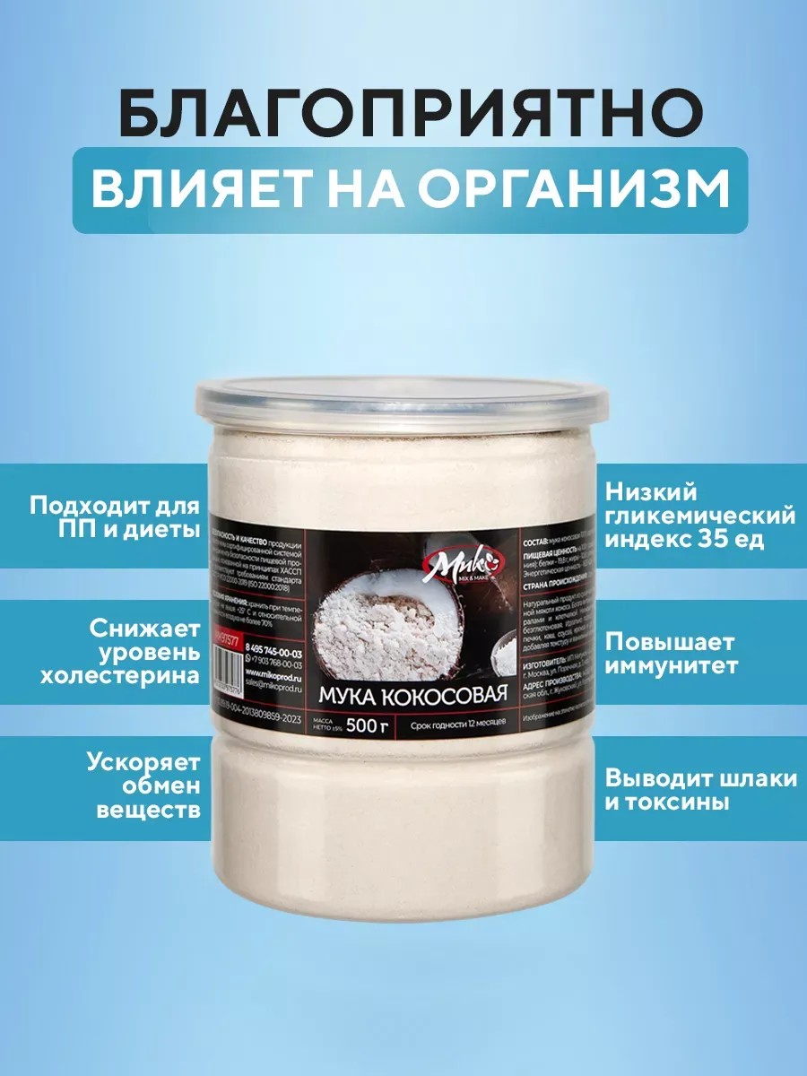 | Комплектация | Мука кокосовая органическая - 500 г; ПЭТ банка - 1 шт.; Крышка пластиковая - 1 шт. |