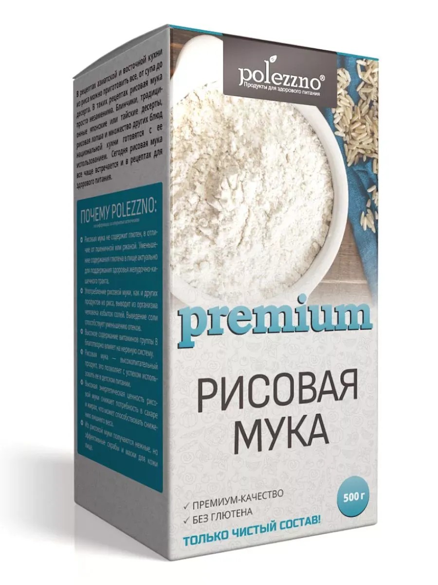 Gluten-free rice flour POLEZZNO is increasingly used in healthy recipes. Why? Rice flour does not contain gluten, unlike wheat or rye. Reducing the gluten content in the diet is important for maintaining gastrointestinal health. Consuming rice flour helps remove excess salts from the body, thereby reducing swelling. Its high content of B vitamins has a beneficial effect on the nervous system. Gluten-free rice flour is a highly nutritious product, making it ideal for use in baby food. The high energy value of gluten-free flour reduces the need for sugar and fat, which can contribute to weight loss. Ingredients: white rice flour. Rice flour is perfect for baking, cheesecakes, pancakes, casseroles, and various desserts. Buy rice flour now! Flour from POLEZZNO - for your health!