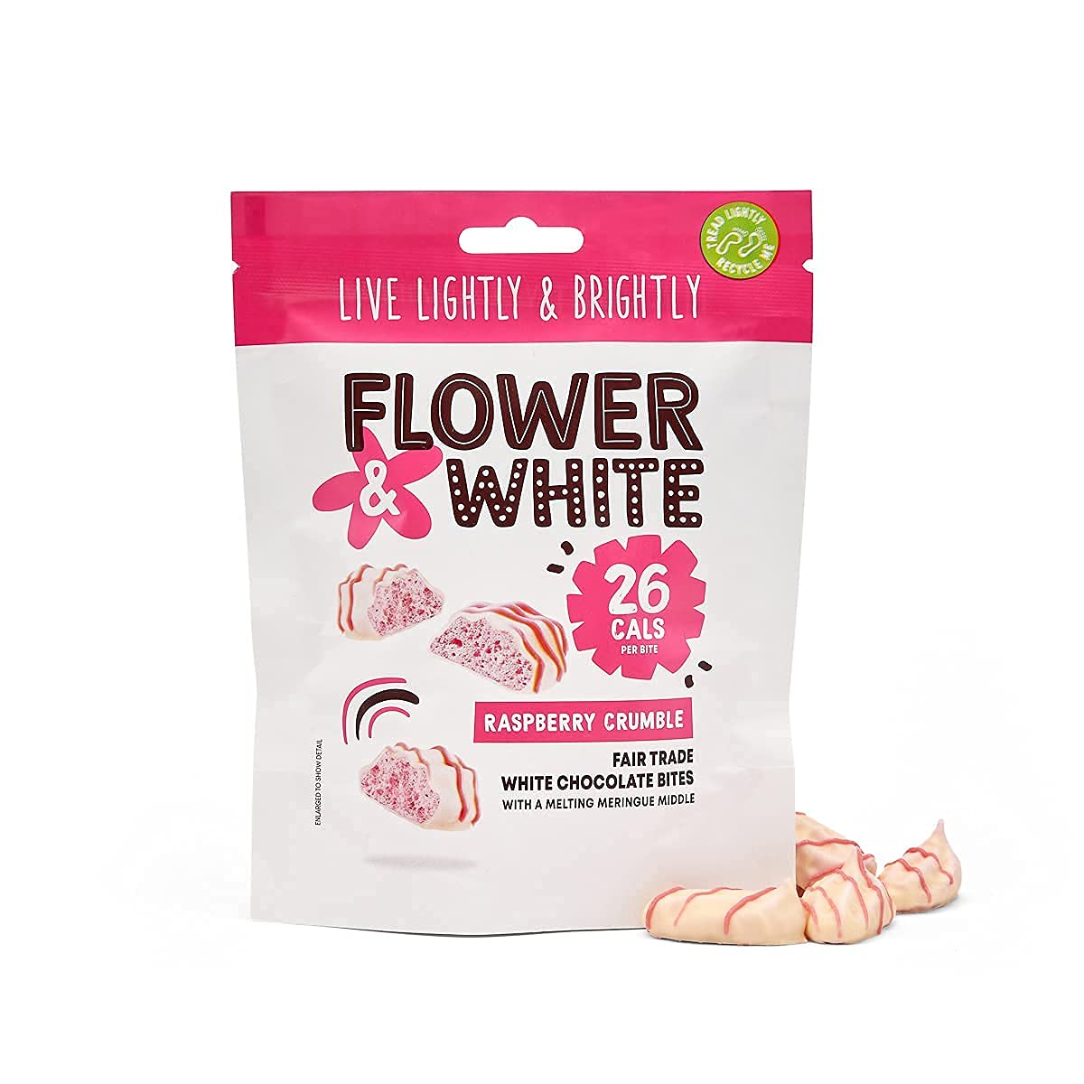 Fairtrade chocolate meringue bar in the shape of a flower and white raspberry with 95 calories per bar, grab one anytime. Perfectly sized for sweet satisfaction, using natural flavors and colors, with no additives or nasties. Every decision we make, we want to look back on with pride, which is why our products are packaged in 100 recyclable packaging and we strive to live plastic-free. 75g. INGREDIENTS White chocolate 50 [sugar, cocoa butter, dried whole milk, dried skimmed milk, emulsifier (soy lecithin), natural vanilla flavoring], raspberry meringue 49 (sugar, pasteurized egg white, natural flavoring, citric acid, color (radish, apple, blackcurrant)).Flower White Raspberry Crumble - Barre de meringue chocolat issu du commerce équitable - 75 gDESCRIPTION DU PRODUIT DESCRIPTION DU PRODUIT Barre de meringue au chocolat issu du commerce équitable en forme de fleur et de framboise blanche avec 95 calories par barre, ramasse une à tout moment. Parfaitement dimensionné pour une satisfaction sucrée, en utilisant des saveurs et des couleurs naturelles, sans additifs et sans méchants. Chaque décision que nous prenons, nous voulons regarder avec fierté, c'est la raison pour laquelle nos produits sont emballés dans un emballage 100 recyclable et nous nous efforçons de vivre sans plastique. 75 g. INGRÉDIENTS Chocolat blanc 50 [sucre, beurre de cacao, lait entier séché, lait écrémé séché, émulsifiant (lécithine de soja), arôme naturel de vanille], meringue framboise 49 (sucre, blanc d'œuf pasteurisé, arôme naturel, acide citrique, couleur (Radish, pomme, cassis).