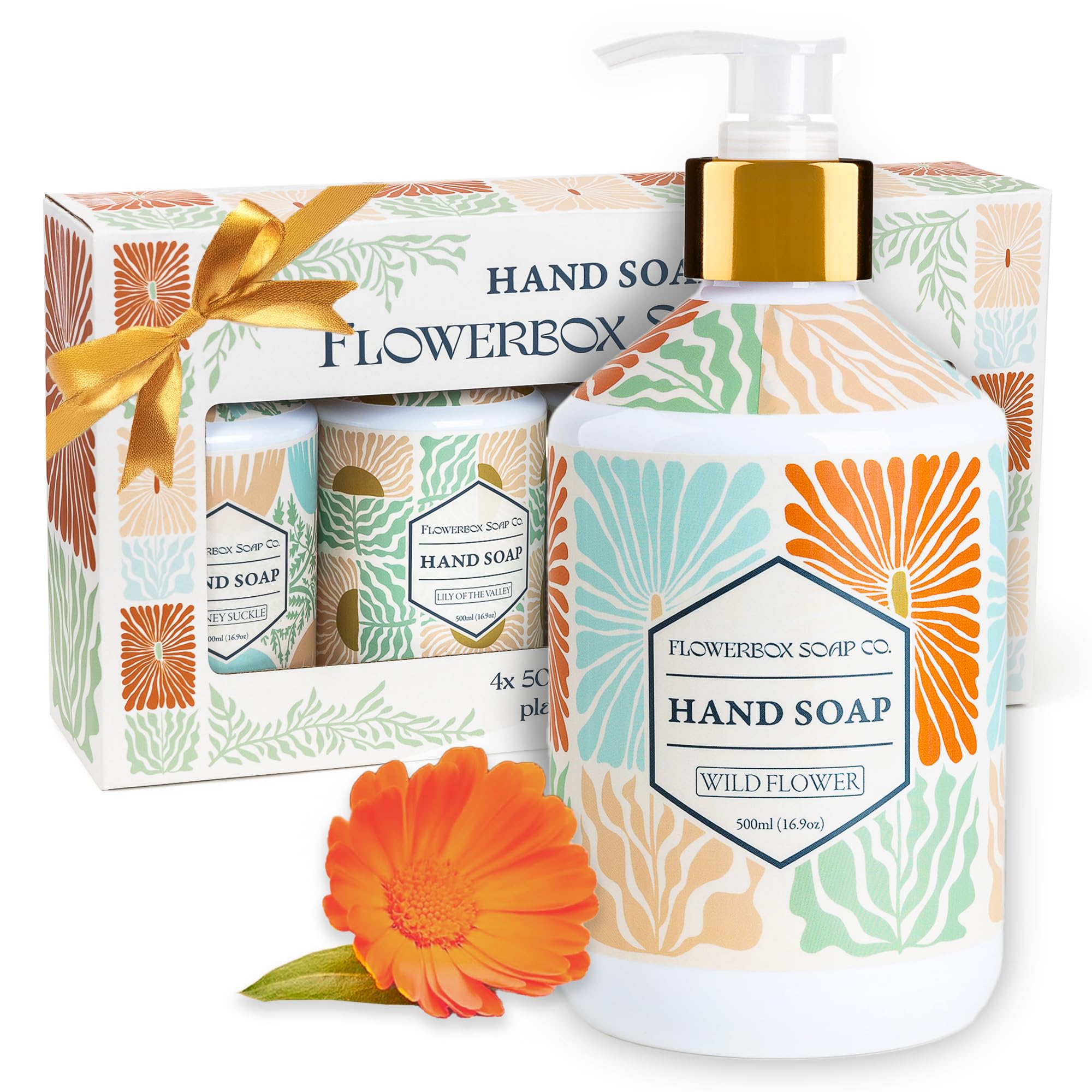 Gift-Ready: Whether for your own home or as a thoughtful gift, this beautifully packaged hand soap variety pack is ideal for holidays, birthdays housewarmings. It's also suitable for offices or guest bathrooms, blending everyday utility elegance. Durable, Leak-Free Design: Made from sturdy plastic, each bottle features a quality gold pump for smooth dispensing. Designed to prevent leaks and breakage, this decorative soap gift set is ideal for everyday use in any office or home setting. Gentle Cleansing Formula: Free of harsh additives like parabens phthalates, this pump hand soap for the kitchen bathroom uses skin-loving ingredients to cleanse without drying. Enjoy soft, clean hands with a gentle formula safe for frequent use. Decorative Bottles: Featuring a soft boho chic floral design, these 500 mL bottles bring a stylish touch to your bathroom or kitchen. This scented hand soap set is ideal for homes, Airbnbs, boutique hotel stays, spas, restaurants, and cafés. Fragrant Soap Collection: Elevate your daily handwashing with this luxury hand soap pack featuring four floral scents—Wildflower, Honeysuckle, Cherry Blossom, and Lily of the Valley. Each scent offers a fresh, nature-inspired handwashing experience.