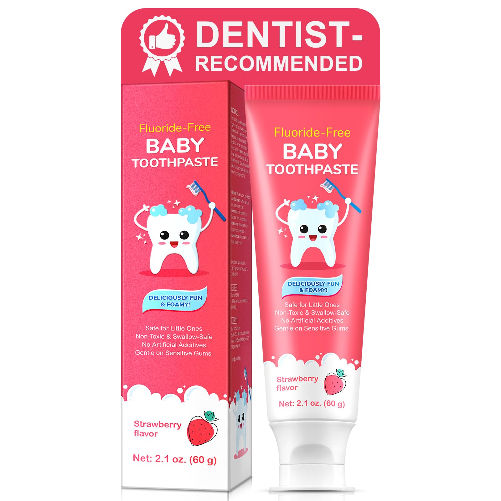 Fluoride-Free Baby Toothpaste — Safe Simple Oral Care for Ages 2-3 Key Features: For children 2-3 years only — Not for infants under 2 year Pea-sized amount recommended (0.5g per use) — Adult supervision required Mild, non-foaming formula — No "delicious" flavors to encourage swallowing Natural ingredients: Xylitol, sodium bicarbonate, and plant-based glycerin Fluoride-free — Safe for children learning to spit (but still requires supervision) How to Use: 1 ? Apply a pea-sized amount to soft-bristled brush 2 ? Brush teeth gently for 30 seconds 3 ? Wipe excess foam with damp cloth (do not rinse) 4 ? Supervise until child can spit reliably What's Included: 1 x Baby Toothpaste (2.1 oz 60g) 2 x Flavor options: Strawberry Watermelon