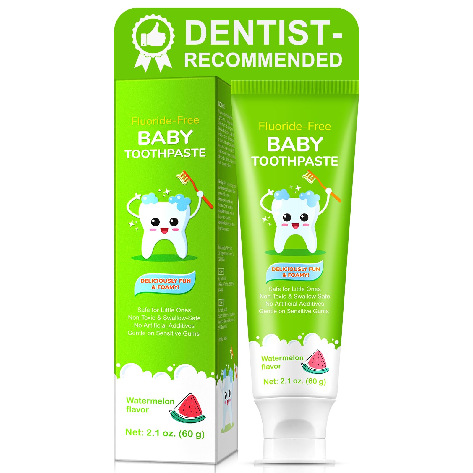 Fluoride-Free Baby Toothpaste — Safe Simple Oral Care for Ages 2-3 Key Features: For children 2-3 years only — Not for infants under 2 year Pea-sized amount recommended (0.5g per use) — Adult supervision required Mild, non-foaming formula — No "delicious" flavors to encourage swallowing Natural ingredients: Xylitol, sodium bicarbonate, and plant-based glycerin Fluoride-free — Safe for children learning to spit (but still requires supervision) How to Use: 1 ? Apply a pea-sized amount to soft-bristled brush 2 ? Brush teeth gently for 30 seconds 3 ? Wipe excess foam with damp cloth (do not rinse) 4 ? Supervise until child can spit reliably What's Included: 1 x Baby Toothpaste (2.1 oz 60g) 2 x Flavor options: Strawberry Watermelon