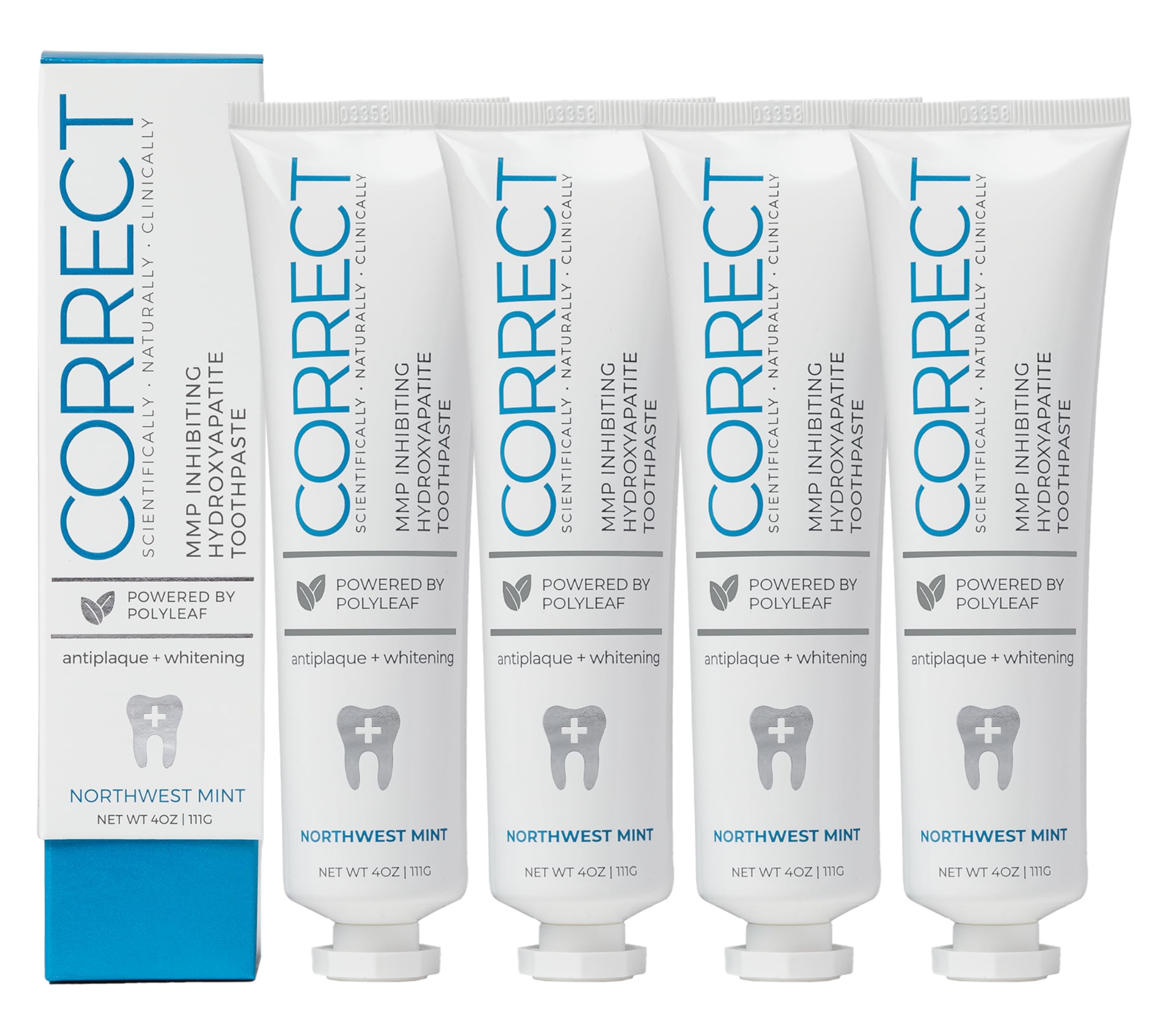 Experience a healthier, brighter smile with Correct Oral Care Toothpaste, a premium fluoride-free hydroxyapatite toothpaste developed by dental, medical, and research professionals. Our sensitive toothpaste is formulated with nano-hydroxyapatite, a clinically backed ingredient that remineralizes enamel, fights cavities, reduces tooth sensitivity, and naturally whitens teeth—providing a safe, effective alternative to fluoride. Hydroxyapatite for Stronger, Healthier Teeth – This fluoride-free toothpaste strengthens enamel by replenishing essential minerals, helping to reverse early enamel damage and protect against tooth decay. Whitening Toothpaste with Low Abrasion Polishing – Our gentle yet effective formula includes Perlite, a mineral-based polishing agent that safely removes surface stains without damaging enamel, making it an excellent choice for those looking for a natural whitening toothpaste. Sensitive Toothpaste for Gum Enamel Health – Designed to soothe sensitive teeth and gums, this advanced formula includes PolyLeaf MMP inhibition technology to help prevent gum erosion, support oral tissue health, and improve overall gum resilience. 100 Clean Safe Ingredients – Made without SLS, titanium dioxide, parabens, charcoal, artificial colors, artificial flavors, preservatives, or fluoride. Infused with Xylitol for extra enamel protection and a refreshing Northwest Mint Flavor. Eco-Friendly Sustainable – Our BPA-free, recyclable packaging supports sustainability while ensuring safe, toxin-free storage. Gentle yet powerful – Safe for adults and children looking for a gentle yet effective way to strengthen and whiten teeth naturally. Try Correct Oral Care's Hydroxyapatite Toothpaste today and enjoy stronger, whiter teeth and healthier gums without the harsh chemicals!