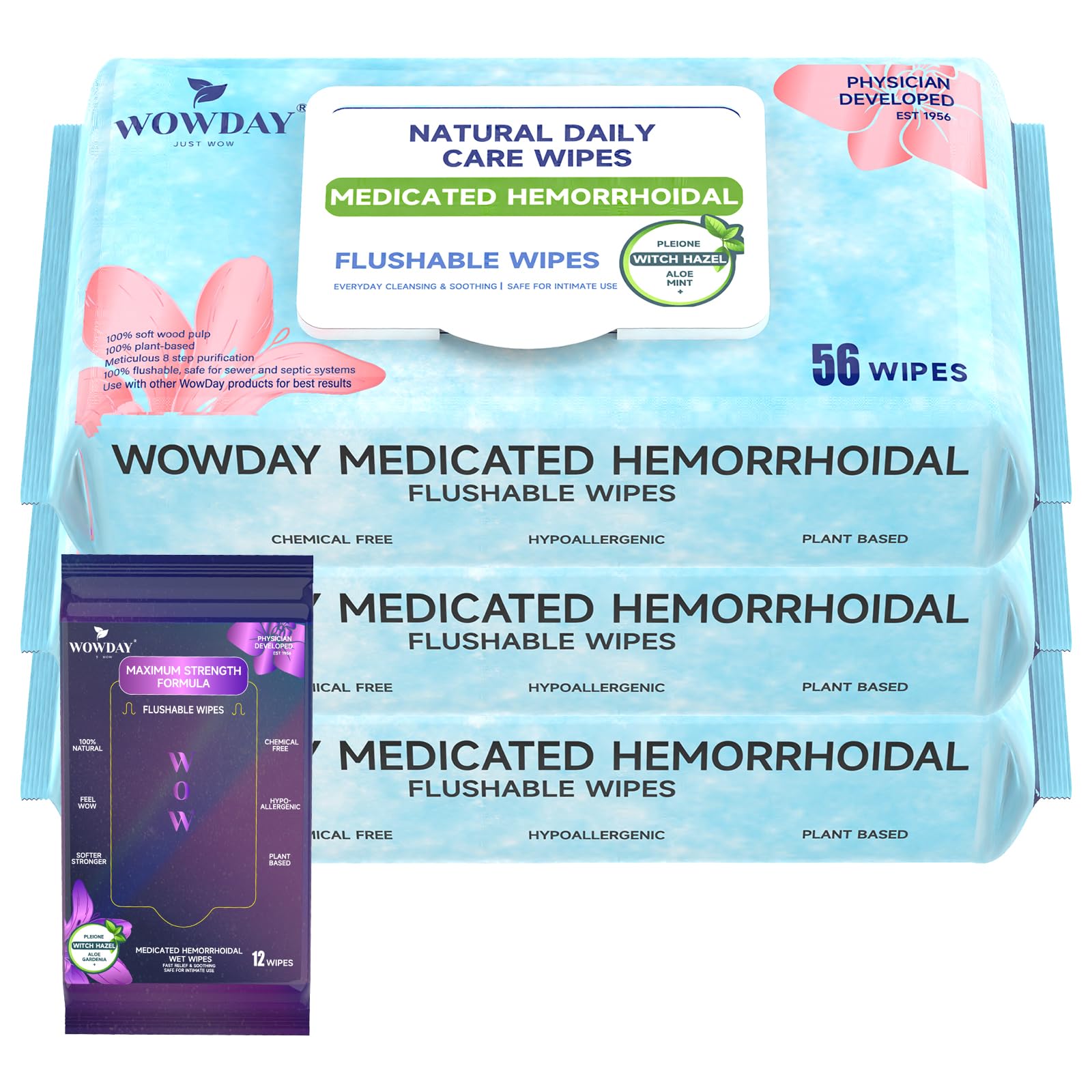 Flushable Hemorrhoid Wipes | Medicated Witch Hazel Wipes Ph Balanced | 180 Count Natural Fragrance Free Adult Hemorrhoids Witch Hazel Wipe for Butt Itch 56 Count (Pack of 3)