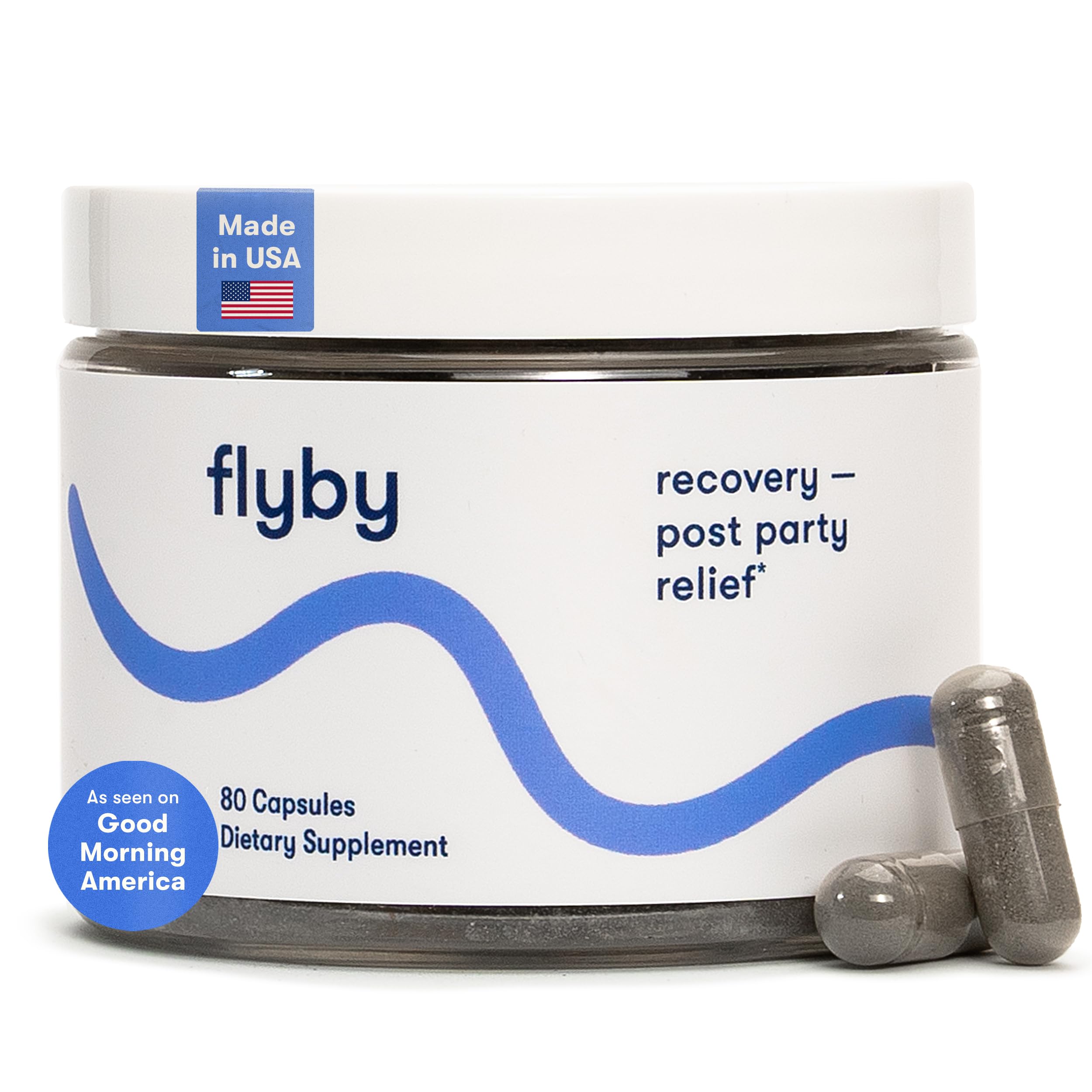 Featured on Good Morning America Made in the USA: Flyby Recovery Supplement is proudly made in the USA with globally sourced ingredients and has been spotlighted on Good Morning America. Experience a premium product trusted by thousands for its transparency and quality. Vitamin C Apple Cider Vinegar: Each serving contains 50 mg of vitamin C and 100 mg of apple cider vinegar, delivering antioxidant power and digestive support in one convenient formula. These trusted ingredients are a cornerstone of wellness routines. Activated Charcoal for Purity: Includes 50 mg of activated coconut charcoal, known for its ability to bind impurities and support the body's natural detoxification. A smart addition for those who prioritize overall wellness. Milk Thistle Seed for Wellness: Packed with 200 mg of milk thistle seed, this renowned ingredient is celebrated for its natural properties to support balance and vitality. Combined with other premium extracts, it helps you feel your best every day. Powerful Dihydromyricetin (DHM) Blend: Featuring 300 mg of DHM per serving, sourced from Ampelopsis grossedentata, this key ingredient helps support your body's natural detox processes. Backed by cutting-edge formulation, this supplement ensures your post-night-out routine is covered. One Month Supply.