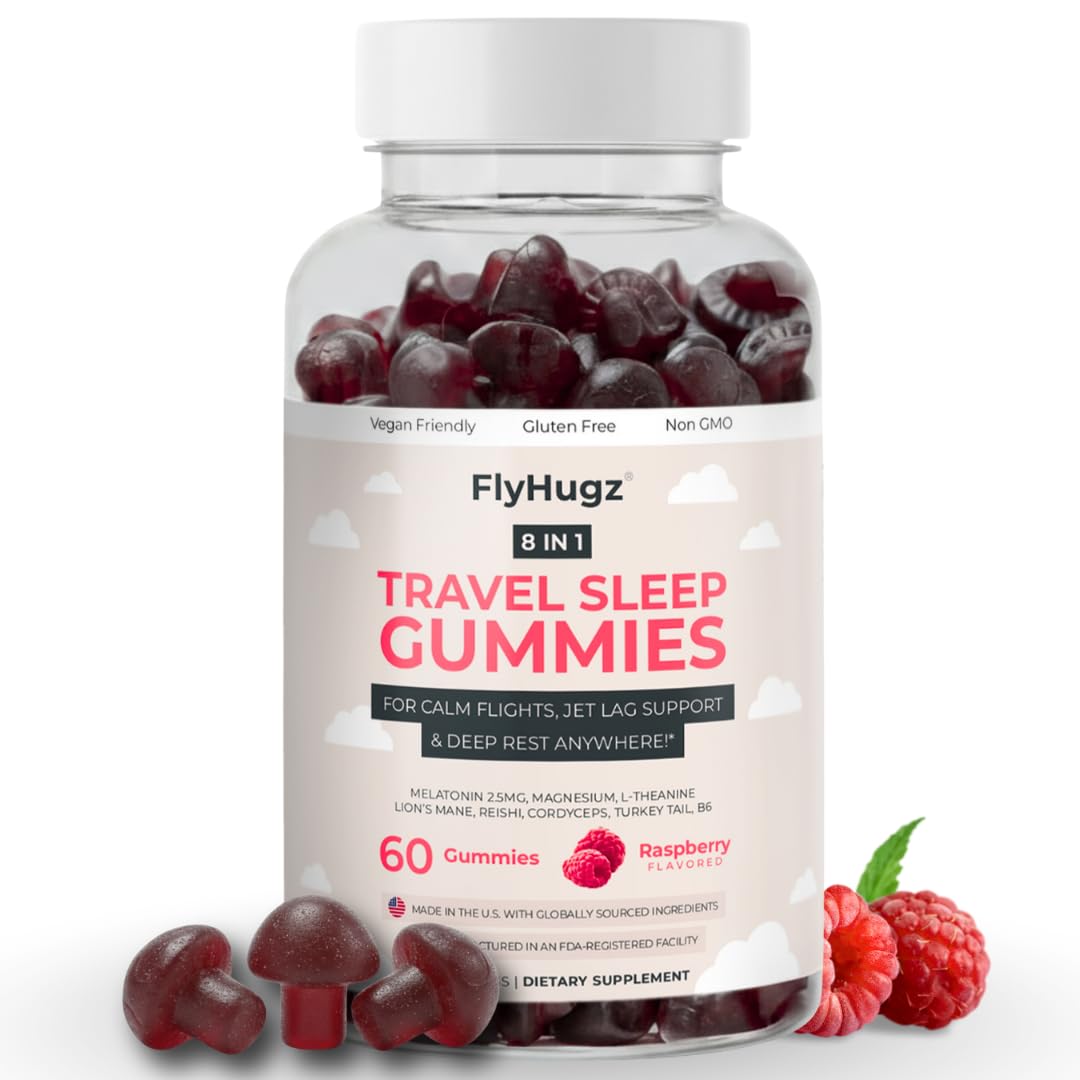 Your On-the-Go Relaxation Partner: Designed for modern travelers seeking a calming nighttime routine. Helps support relaxation and a peaceful transition into rest, so you wake up feeling refreshed wherever your travels take you. DELIGHTFULLY TASTY: Sleep gummies come in Raspberry flavor. Gluten free formulated with no synthetic flavors or colors. HOW TO TAKE: Take 2 gummies 30 minutes before bed. Chew thoroughly before swallowing. Calming Travel Support Blend: Made with melatonin, L-theanine, and magnesium, offering gentle support for relaxation and maintaining a sense of calm while on the move. FLYHUGZ SLEEP GUMMIES: Our Melatonin gummies, with L-Theanine and Botanical Extracts, work with your body to help you fall asleep and stay asleep.