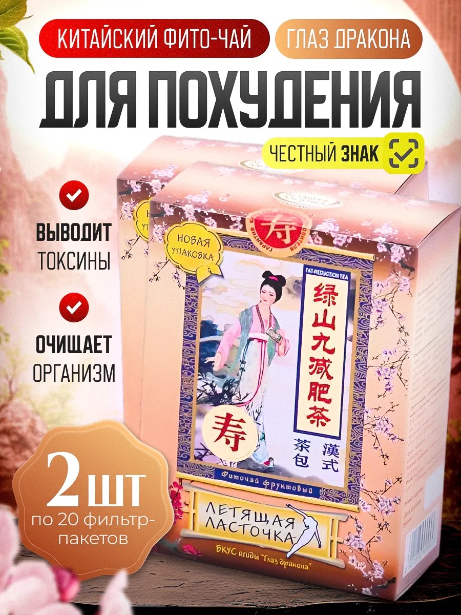 Chinese tea "Flying Swallow Dragon's Eye" is a drainage drink for weight loss that promotes the elimination of excess fluid from the body and reduces swelling. This sugar-free herbal tea helps cleanse the intestines, improves digestion, and eliminates indigestion. The drink acts as a natural detoxifier, removing waste and toxins, and also has a mild diuretic and laxative effect, promoting healthy weight loss in both men and women. This herbal tea bag not only aids weight loss but also cleanses the liver and gallbladder, reduces fat levels in the blood and on the walls of blood vessels, and improves skin condition. The tea can be used as a natural choleretic and laxative, which also helps normalize intestinal microflora. This drink is suitable not only for those trying to lose weight or following a diet, but also for those who adhere to a healthy diet. This gentle fat-burning tea helps eliminate swelling and promotes safe weight loss. This dietary supplement tones the body, triggering a process of even fat burning in problem areas: the stomach, arms, and legs. This low-calorie drink improves metabolism, removes excess water, and effectively combats cellulite. The tea also helps eliminate bloating, constipation, and speeds digestion. Unlike tablets or capsules, tea bags offer a pleasant fruity-herbal flavor. Herbal tea is an excellent choice for gentle and safe weight loss and improved overall well-being!