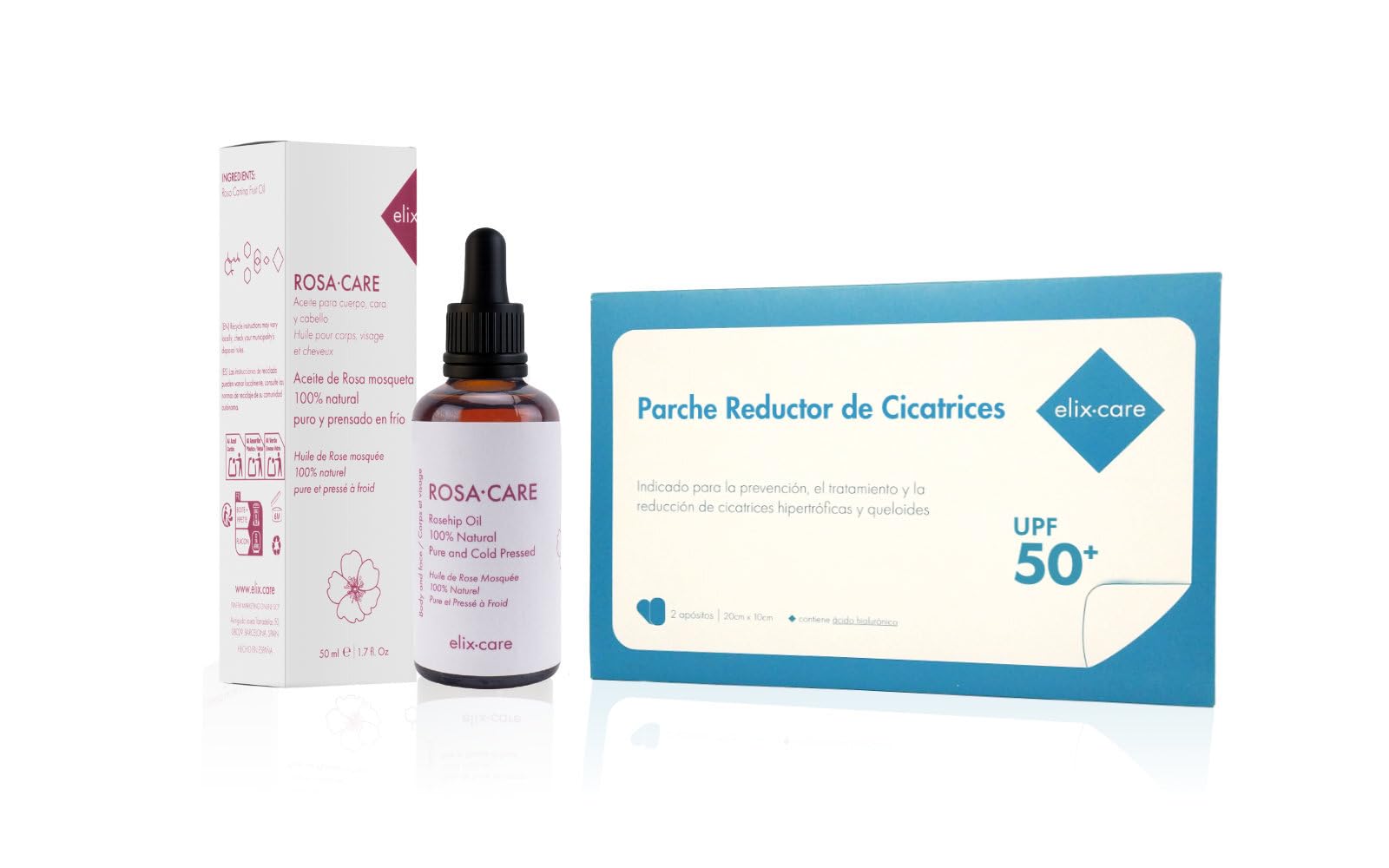 Het Elix-Care littekenpakket is bedoeld om de vermindering van littekens te maximaliseren, dankzij de gecombineerde voordelen van 100 pure rozenbottelroos en de littekenreductiepleister met hyaluronzuur.
