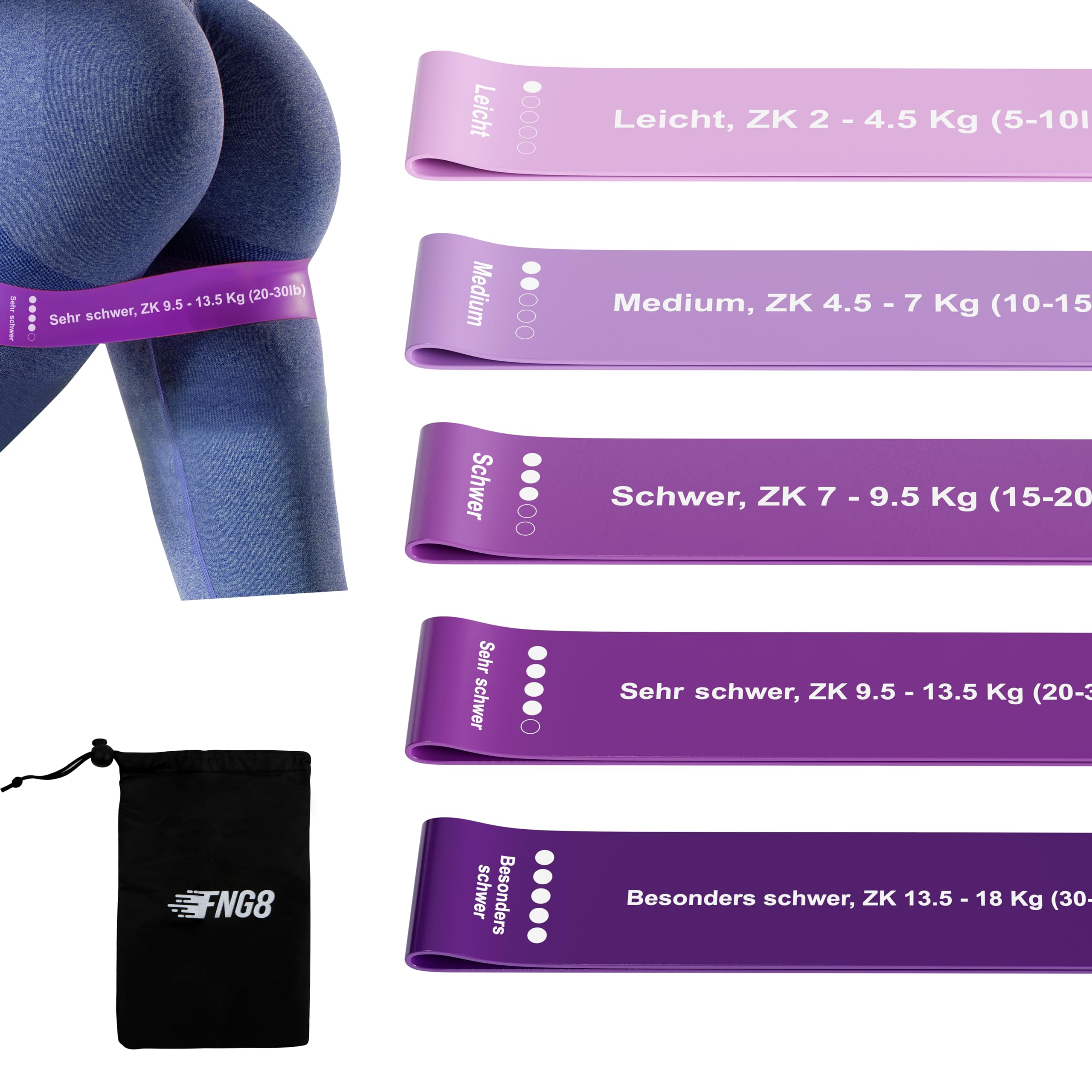 Ideal for different exercises - with this rubber band Sport Set you can train your upper and lower area of ??the body at any location.Train your buttock muscles as well as the arms, waist, hips and legs for the perfect bikini figure.Scan the QR code for even more exercises.Fitness rubber band Set - This 5 -part rubber band sport set can be used for training or rehabilitation as part of physiotherapy.Our rubber band fitness.Set Surf for positive and negative power on muscles and joints.The Elastic Band Fitness Set can also be used after operations.600 mm x 50 mm size - the resistance tapes in this set measure 60 cm and are 5 cm wide.Each training band fitness band consists of natural latex material and is non-toxic, non-slip and odorless.The terrace set also includes a black, portable storage bag.It is suitable for both women and men.The exercises are printed on your sports band in German- 4 different exercises were printed directly on each booty band.The exercises are in German and easy to follow.You can stretch and train all important muscle groups.5 Different resistance levels - our resistance tapes set offers a color -coded progressive resistance system.The resistance tape strength training set has the following resistances: 2-4.5 kg, 4.5-7 kg, 7-9.5 kg, 9.5-13.5 kg and 13.5-18 kg.As soon as you have more strength through training, you can start color with the next resistance band.