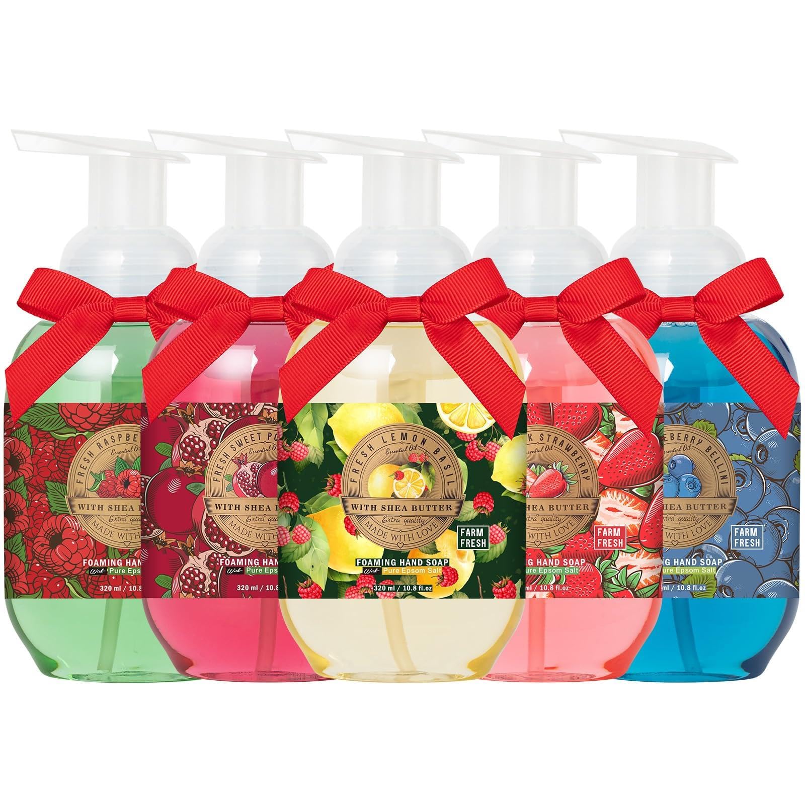 5. EXCEPTIONAL VALUE WITH LONG-LASTING QUALITY With five full-sized 500ml bottles (1.6L total), this set provides extended use for a single household or allows you to coordinate scents in different rooms. The high-quality, leak-proof pumps ensure smooth dispensing and lasting durability, making it a smart and stylish investment for any home. 4. PERFECT FOR EVERY SINK EVERY OCCASION Ideal for placing in kitchens, guest bathrooms, powder rooms, or offices. Makes a wonderful gift for housewarmings, hostess gifts, birthdays, Mother's Day, Teacher Appreciation, Christmas, or as a self-care treat. A practical yet luxurious upgrade to everyday essentials for wives, moms, friends, or anyone who appreciates a beautiful home. 3. THOUGHTFULLY DESIGNED AS A READY-TO-GIFT SET Presented in a beautifully designed, reusable gift box with an included greeting card, this set requires no additional wrapping. The elegant packaging and sophisticated bottle designs make it an impressive, Instagram-worthy gift that shows you've put thought into your selection. 2. GENTLE YET EFFECTIVE CLEANSING WITH RICH FOAM Our formulated soap creates a rich, airy foam that effectively removes dirt while being gentle on skin. Made with epsom salt, shea butter, vitamin E, essential oil. Enriched with moisturizing ingredients, it cleanses leaving hands feeling soft, clean, and never tight or dry—perfect for frequent use. 1. FIVE LUXURIOUS FRUIT-FORWARD SCENTS FOR DAILY INDULGENCE Transform everyday handwashing into a sensory delight with our collection of five distinct, premium foaming hand soaps (500ml each). Experience the creamy sweetness of Fresh Milk Strawberry, the sparkling elegance of Blueberry Bellini, the juicy harmony of Raspberry Peach, the exotic richness of Sweet Pomegranate, and the herbaceous freshness of Lemon Basil. Each scent leaves hands delicately fragranced.