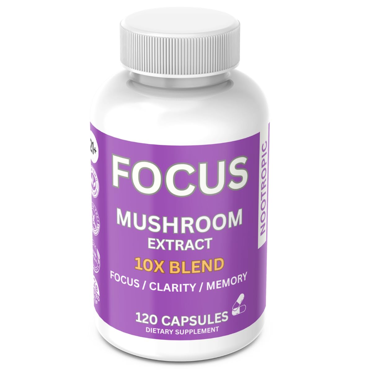 Focus 10x Complex Mushroom Capsules Per Jar Focus Clarity Memory Overall Wellness Road Trip Non GMO Gluten Free 100% Natural Lab Tested Lions Mane White Button Turkey Tail (120 Capsules)