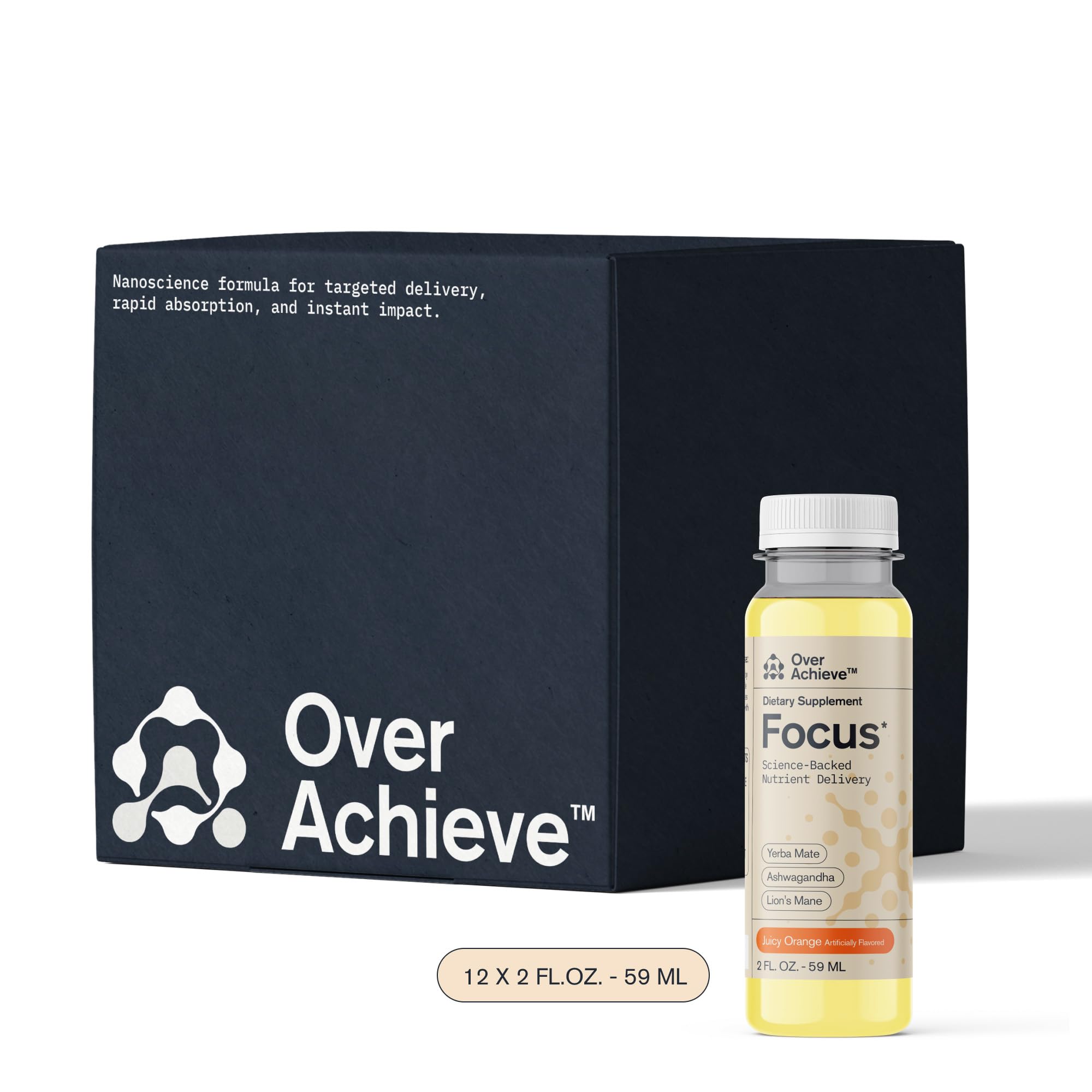 OVERACHIEVE Focus Supplement with Advanced Nanoscience Technology, 12 Pack, Contains Yerba Mate, Ashwagandha, Lions Mane Mushroom, Nootropic Brain Supplements, Orange Drink, 2 oz