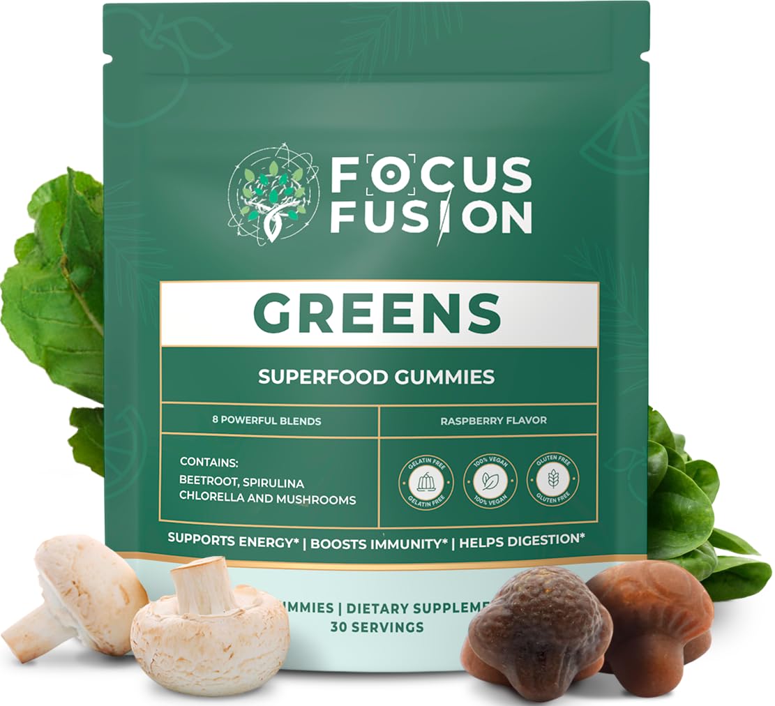 What's Included One resealable bag with 60 chewable gummies (30 servings), featuring kiwi fruit and other plant-derived ingredients intended for daily dietary use. Convenient Enjoyable Format Naturally flavored gummies provide a pleasant alternative to powders or juices—no mixing required and easy to include in daily routines. Plant-Sourced Formula This supergreens gummy blend is made with plant-based ingredients that fit easily into modern daily habits without additional preparation. Balanced Ingredient Blend Formulated with prebiotic and probiotic ingredients commonly used in dietary supplement formulations. Daily Plant-Based Supplement Focus Fusion Greens gummies feature a carefully selected blend of 74 organic greens, vegetables, and fruit-derived ingredients designed to complement everyday dietary routines.