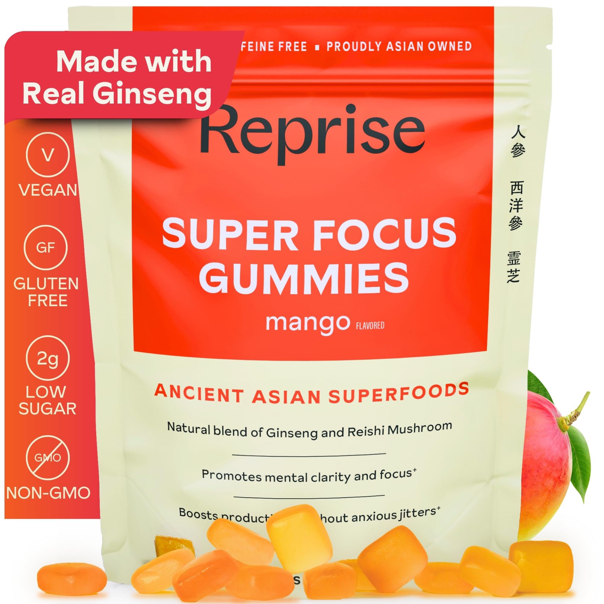 LOW SUGAR: Only 2g of Natural Sugar: Plant-based, Vegan, Non-GMO, Gluten-free Gelatin-free: each Reprise Korean Red Panax Ginseng gummy contains 3g of sugar - that's the equivalent to 1 5 of a banana. TROPICAL MANGO FLAVOR: 45 natural mango-flavored gummies with perfect chew. 240mg (equivalent to 1200mg whole herbs) extract. Reprise gummies derive their colors solely from the natural pigments with NO synthetic vitamins, NO artificial flavors, NO added colors, NO artificial sweeteners, NO preservatives. MAX POTENCY: Focus supplements using traditional full-spectrum Korean Red Ginseng extracts and Reishi Mushroom extracts - full-spectrum extraction maintains all the natural ratios of the adaptogenic roots - preserving functional essential oils. PREMIUM INGREDIENTS: Thanks to our relationships with farmers, growers, and distributors and our rigorous sourcing and lab-testing processes, we ensure the highest quality Korean Red Ginseng herbal supplements, with over 70 of raw Ginseng and Reishi Mushrooms being rejected to ensure the finest. ANCIENT SUPERFOODS: Reprise SUPER FOCUS Gummies are formulated by a team of Harvard doctors. Korean Ginseng American Ginseng are adaptogenic roots used for centuries to promote focus, enhancement, and energy for adults - for men and for women. .