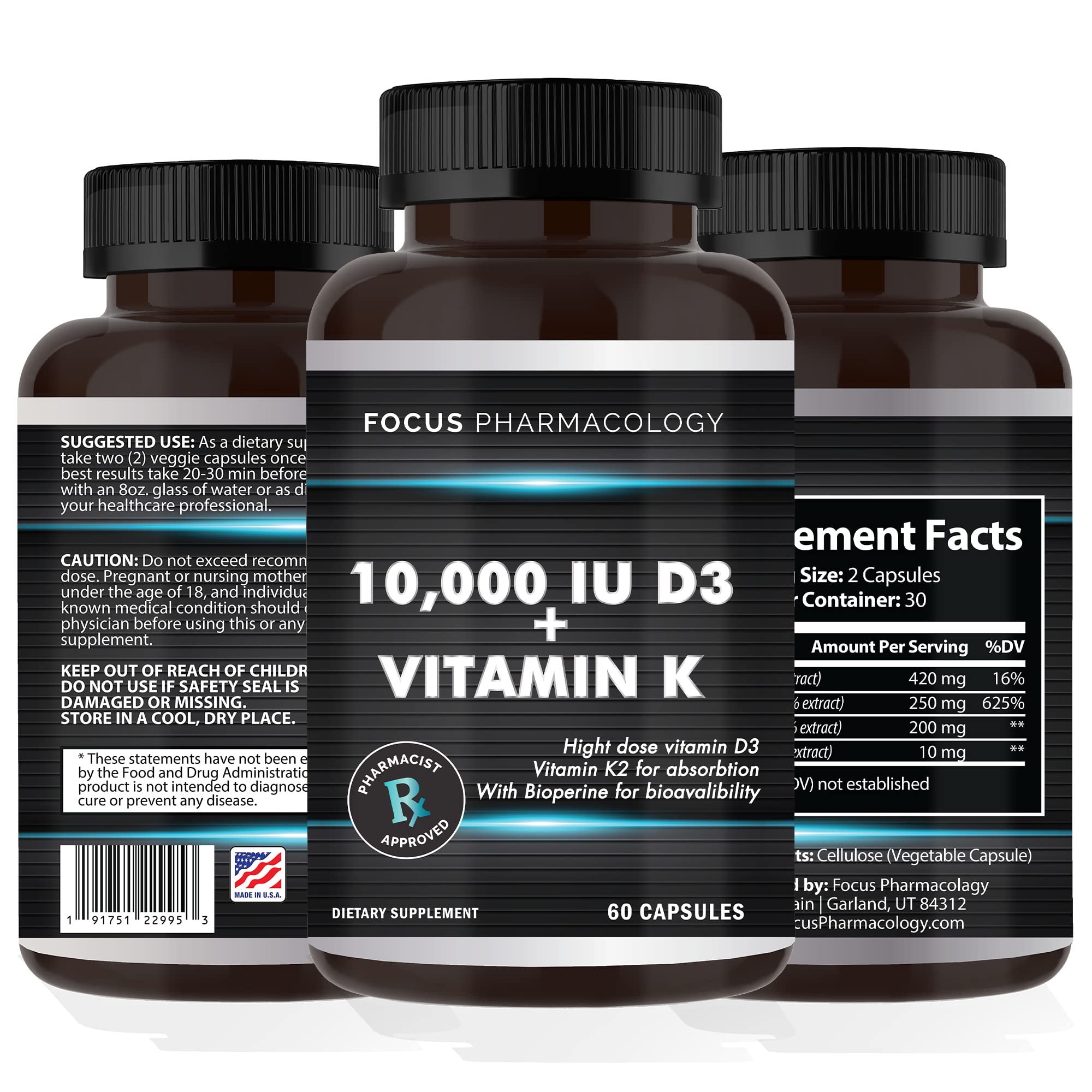 This supplement contains the fundamental nutrients our body needs of K2 and D3. With the help of K2 it will improve calcium movement in and out of the bones which helps with proper bone density. The bones are the reservoir of calcium in order to maintain a certain level in the blood. The K2 and D3 supplement can improve blood calcium levels, help prevent calcium plaques that build in the arteries, and help prevent kidney stones. ABOUT FOCUS PHARMACOLOGY: The Focus Pharmacology line was designed by research scientists based on the recommendations of pharmacists and approved by your local independent pharmacist. Every product is designed to contain only key ingredients that have been reported in scientific literature to elicit the desired response in people at a safe level. Product is manufactured in the USA in a FDA registered facility. Focus Pharmacology products are designed to be generally safe when taken in combination with prescription drugs and come with the support of your local pharmacist. Consult with your pharmacist about all drugs (OTC and prescription) that you take and any potential interactions with supplements you are considering. They are there to help you make informed decisions about your health needs and ensure that your supplements are filling you nutritional needs safely. TOP FEATURES High Dose of Vitamin D3 (10,000 Units) High Dose of Vitamin K2 (200 mg) Bioperine for Maximum Absorption KEY INGREDIENTS 10,000 IU vitamin D3 200mg vitamin K2. PRODUCT INFORMATION: Daily serving for an adult is 1-2 capsule at one time. Capsules Per Container: 60 in 1MO and 180 in 3MO. Manufacturing data and lot number is on the bottom of each bottle. Each bottle will come with a desiccant pack (DO NOT EAT) it. Packing Included 1 Bottle Vitamin D