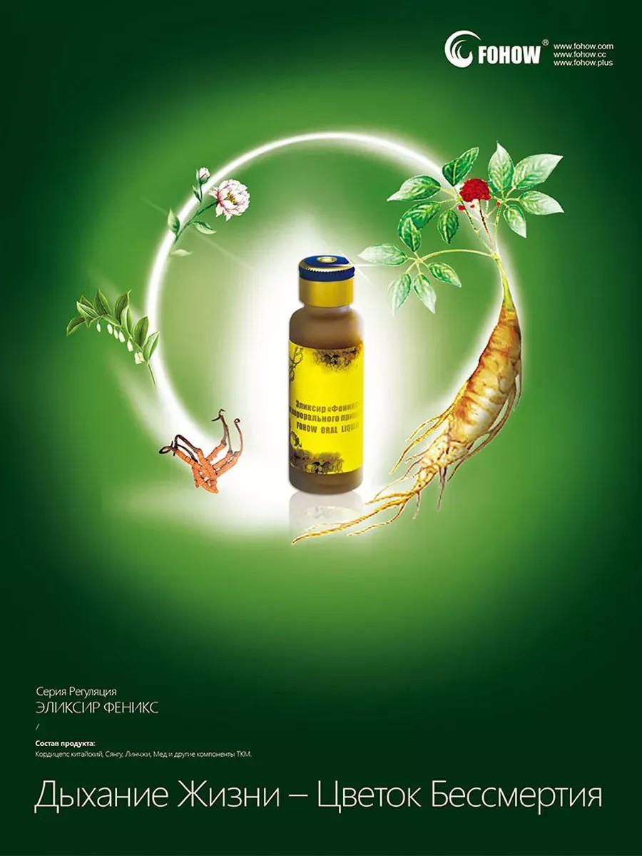 Эликсир Феникс с кордицепсом от Fohow – это фитопрепарат и питательный комплекс, разработанный для укрепления иммунитета и профилактики онкологических заболеваний. Он повышает иммунно-защитную функцию организма, стимулирует рост лимфоцитов и повышает содержание иммуноглобулина и комплемента. Эликсир содержит полисахариды линчжи (лентинан), кислоту кордицепса, уридин, аденин, тритерпен, полипептиды, гликопептиды, ферменты, белки, многочисленные аминокислоты, витамины B1, B2, B12 и K, алкалоиды и другие эффективные компоненты. Эликсир Феникс с кордицепсом применяется при профилактике и лечении рака, а также при заболеваниях дыхательной системы, сердечно-сосудистой системы и кровеносных сосудов мозга. Он обладает двойной регуляторной функцией в отношении кровяного давления, эффективно расслабляет коронарную артерию, расширяет капиллярные сосуды, улучшает микроциркуляцию, увеличивает снабжение миокарда кислородом, очищает кровь. Эликсир Феникс с кордицепсом оберегает печень, активизирует метаболизм печени в отношении лекарств, токсинов; сохраняет структуру клеток печени, регулирует синтез белка; повышает регенерационные способности печени; эффективно повышает функции печени. Эликсир стимулирует восстановление поврежденных клеток, при вирусном гепатите эффективен до 83 %. Он имеет явно выраженный эффект при воспалении печени, склерозе печени, гепатите В и других заболеваниях печени. Состав: Кордицепс китайский — 75%, Линчжи — 6%, Ароматный гриб — 6%, молодые побеги бамбука — 5%, мед — 2% и другие компоненты ТКМ.